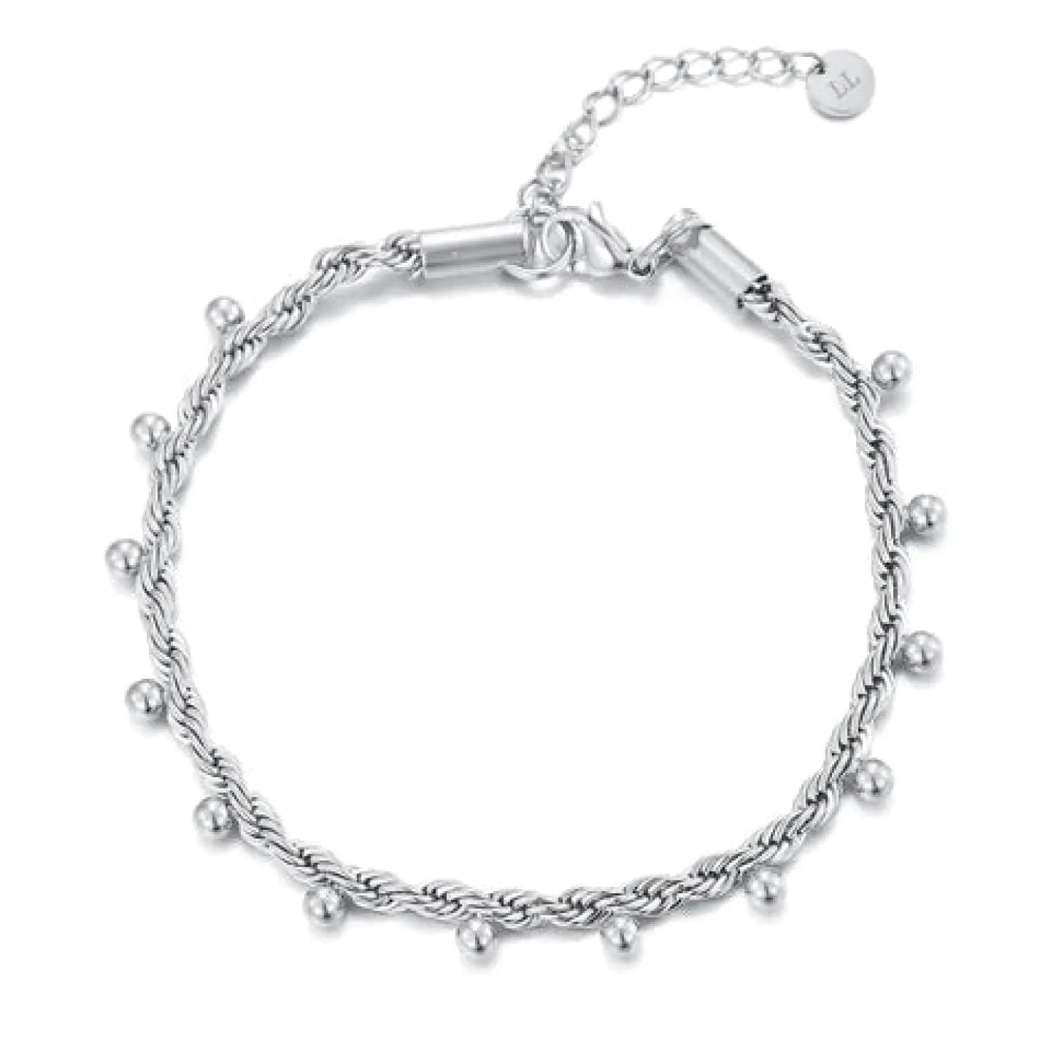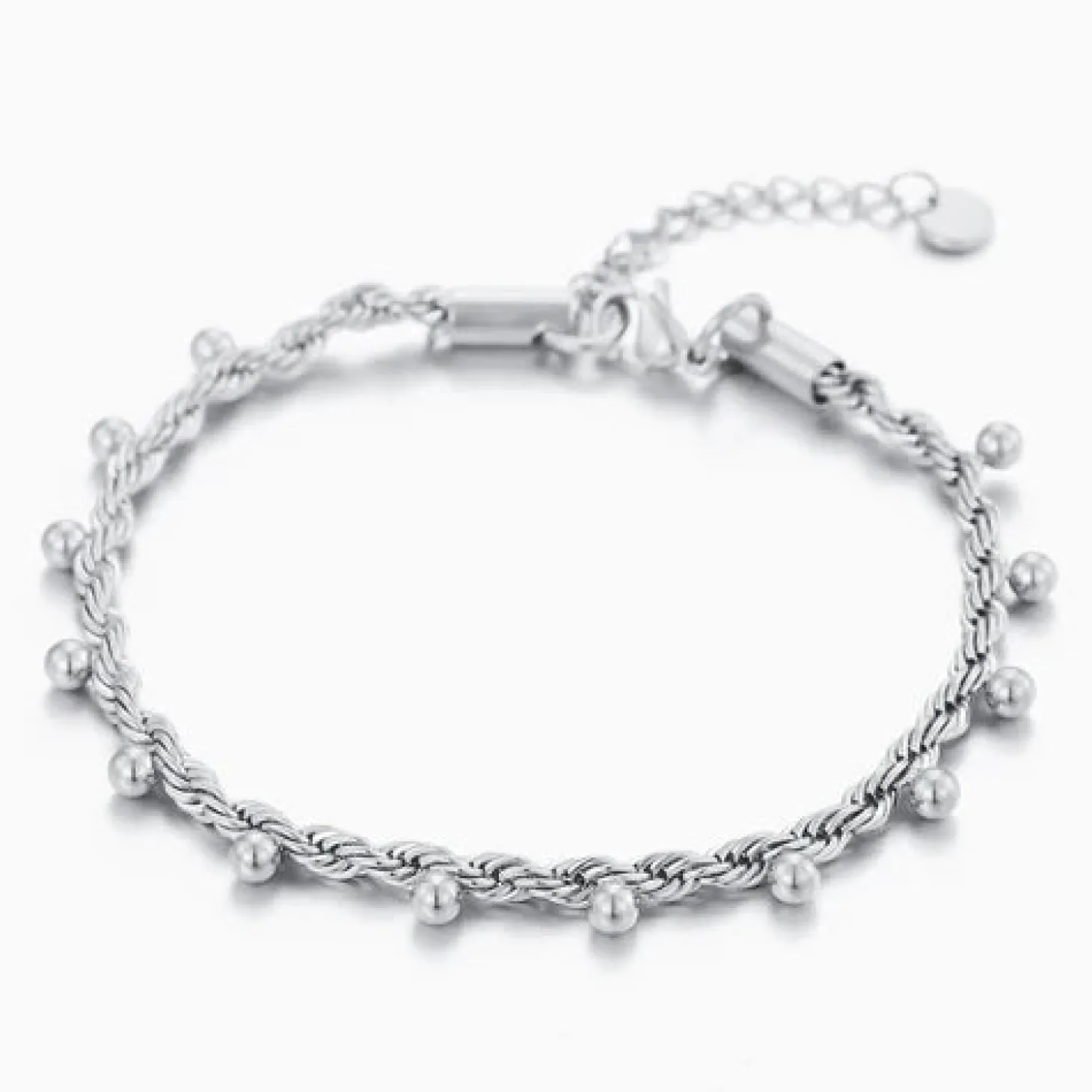 Deze gedraaide schakel armband met balletjes is 16 cm lang en kan nog eens met 4 cm verlengd worden. Gemaakt van hoogwaardig stainless steel. Dankzij het verlengstukje is de armband verstelbaar en geschikt voor verschillende polsmaten.