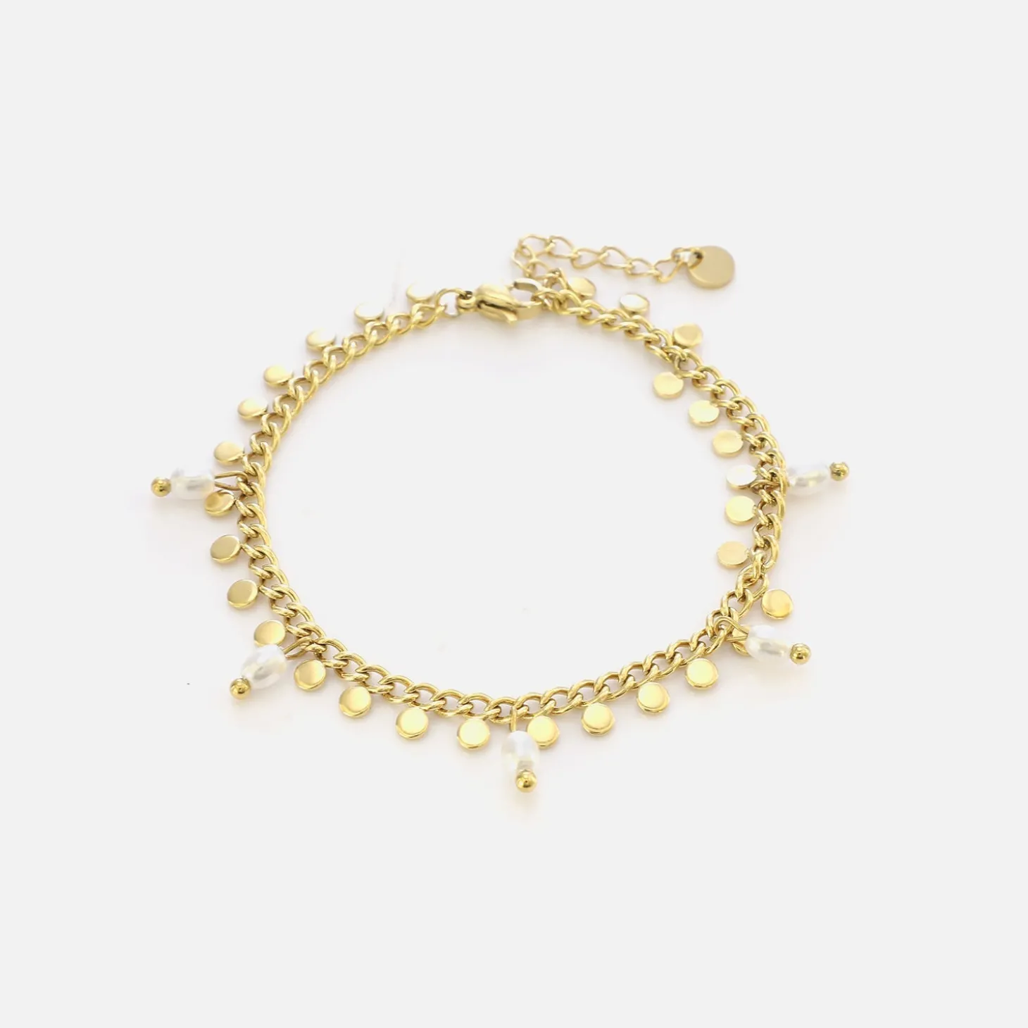 Armband met muntjes en parels. 16 cm lang en kan nog eens met 4 cm verlengd worden. Gemaakt van hoogwaardig stainless steel. Dankzij het verlengstukje is de armband verstelbaar en geschikt voor verschillende polsmaten. (let op! parels kunnen verkleuren door contact met water)