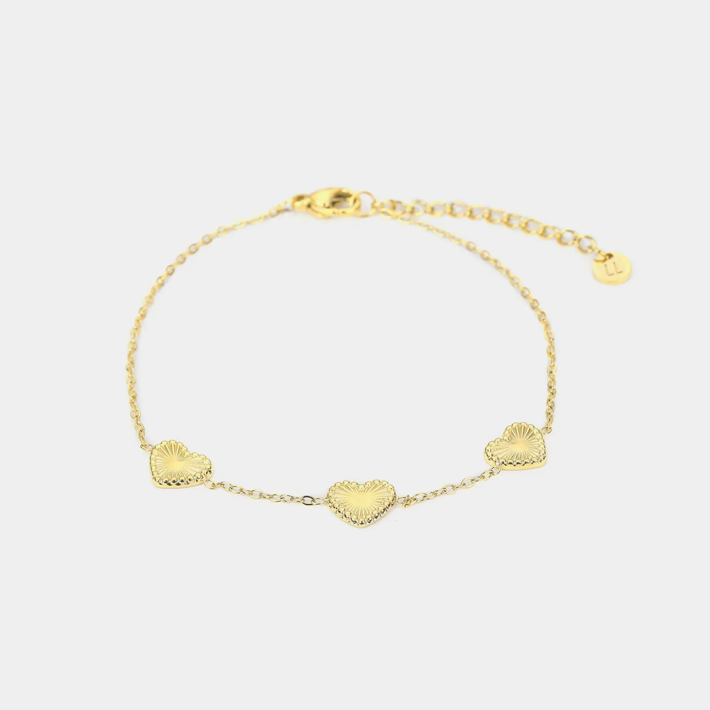 Armband met drie hartjes. 16 cm lang en kan nog eens met 4 cm verlengd worden. Gemaakt van hoogwaardig stainless steel. De hartjes zijn ongeveer 7mm groot. Dankzij het verlengstukje is de armband verstelbaar en geschikt voor verschillende polsmaten.