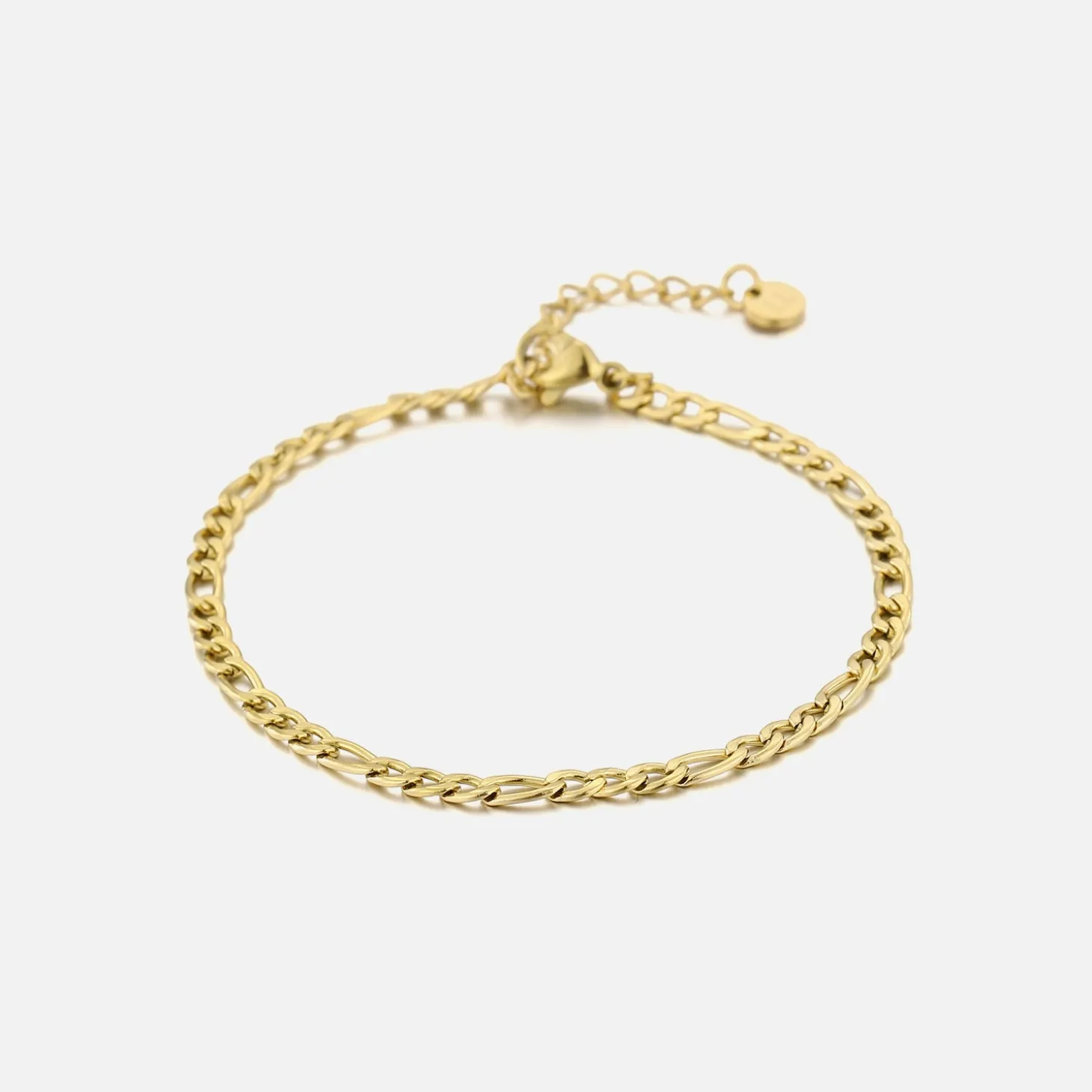 Gouden figaro schakel armband. 16 cm lang en kan nog eens met 4 cm verlengd worden. Dikte van de armband is 3mm. Gemaakt van hoogwaardig stainless steel. Dankzij het verlengstukje is de armband verstelbaar en geschikt voor verschillende polsmaten. goed te combineren met andere gouden sieraden.