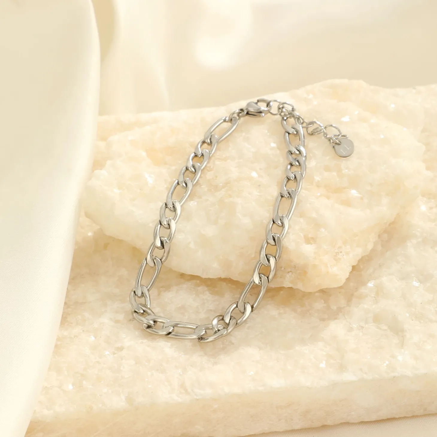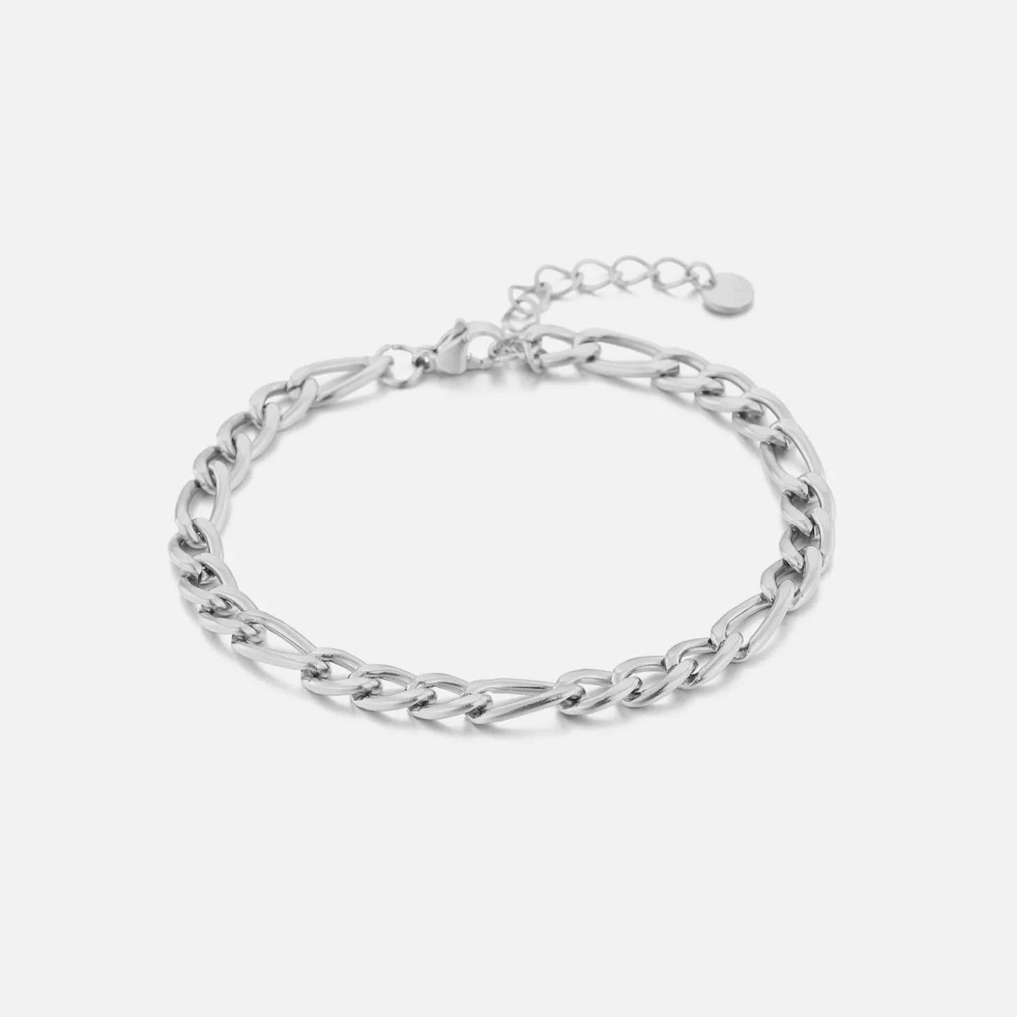 Zilveren figaro schakel armband. 16 cm lang en kan nog eens met 4 cm verlengd worden. Dikte van de armband is 5mm. Gemaakt van hoogwaardig stainless steel. Dankzij het verlengstukje is de armband verstelbaar en geschikt voor verschillende polsmaten. Goed te combineren met andere zilveren sieraden.
