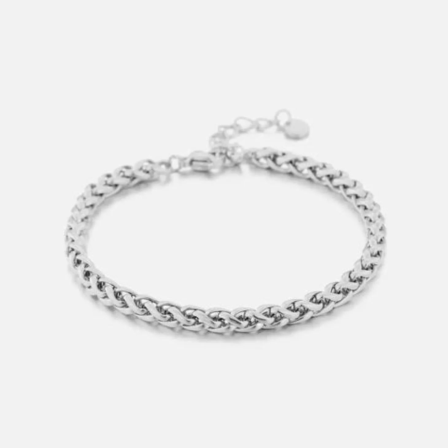 Zilver gedraaide schakel armband. 16 cm lang en kan nog eens met 4 cm verlengd worden. Dikte is 4mm. Gemaakt van hoogwaardig stainless steel. Dankzij het verlengstukje is de armband verstelbaar en geschikt voor verschillende polsmaten. Goed te combineren met andere zilveren sieraden.