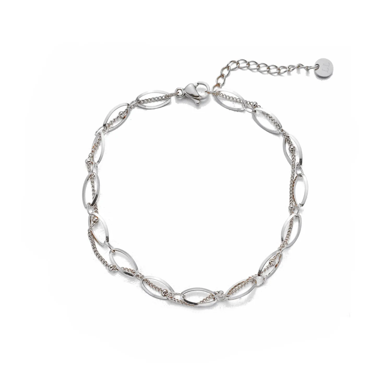 Zilver twee laags armband. Lengte is 16cm + 4cm verlengstukje. Gemaakt van hoogwaardig stainless steel. Deze armband kun je vol hangen met bedeltjes uit de ontwerp je eigen sieraden collectie. (design your own) De bedeltjes zijn te combineren met zowel armband, ketting & oorbellen.