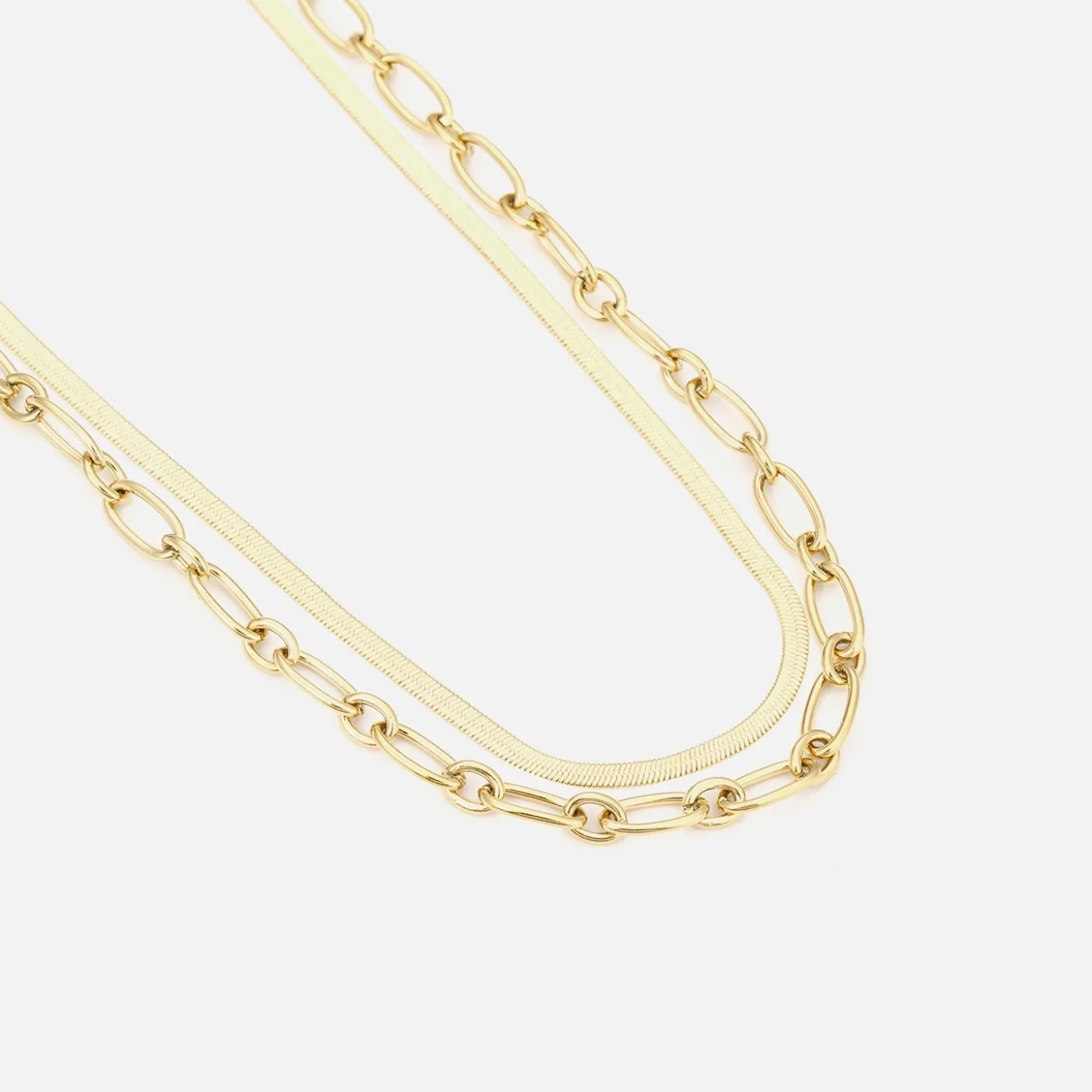 Goud twee laags platte schakel ketting. Lengte is 40cm + 5cm verlengstukje. Gemaakt van hoogwaardig stainless steel. Deze ketting kun je vol hangen met bedeltjes uit de ontwerp je eigen sieraden collectie. (design your own) De bedeltjes zijn te combineren met zowel armband, ketting & oorbellen.
