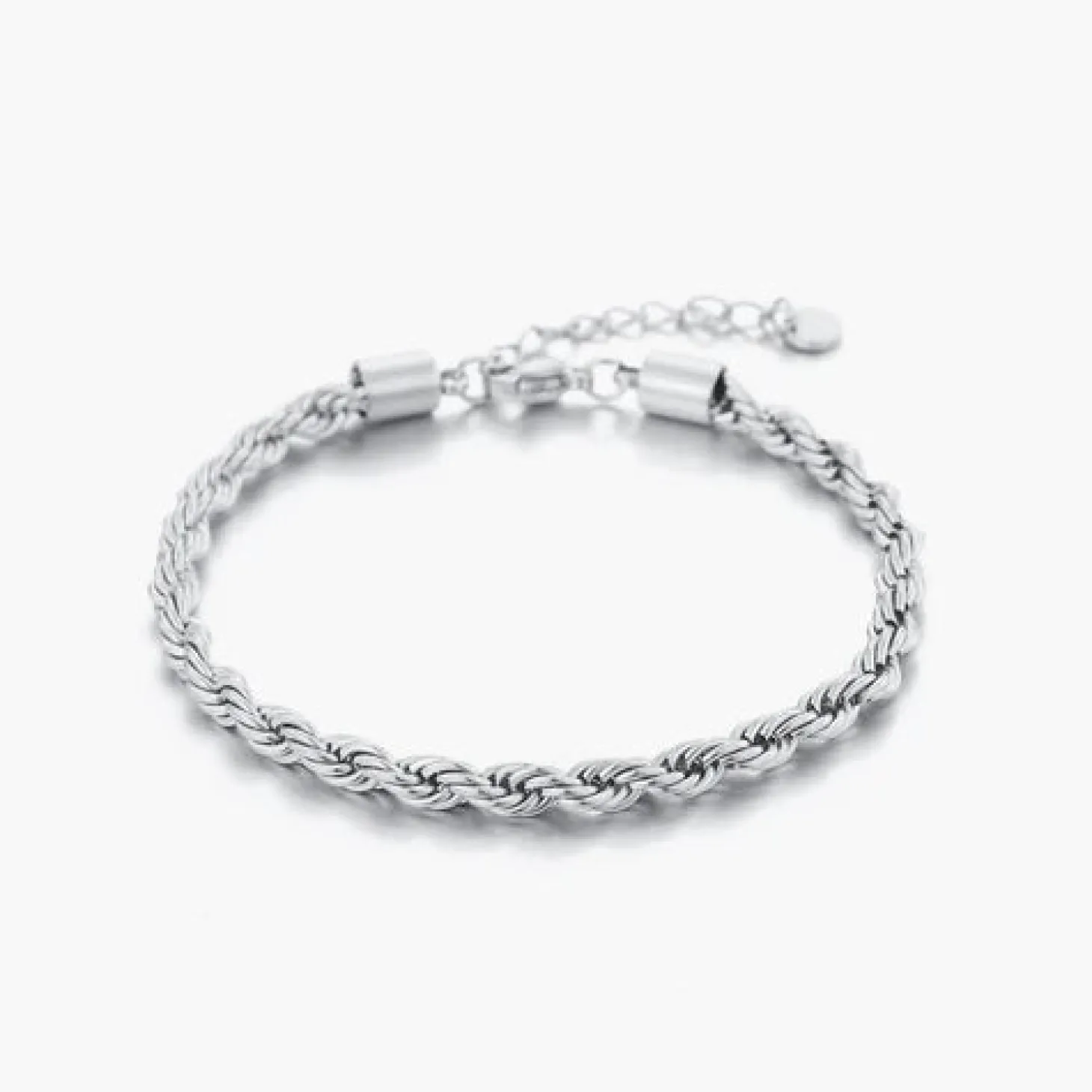 Zilver gedraaid schakel armband. 16 cm lang en kan nog eens met 4 cm verlengd worden. Gemaakt van hoogwaardig stainless steel. Dankzij het verlengstukje is de armband verstelbaar en geschikt voor verschillende polsmaten.