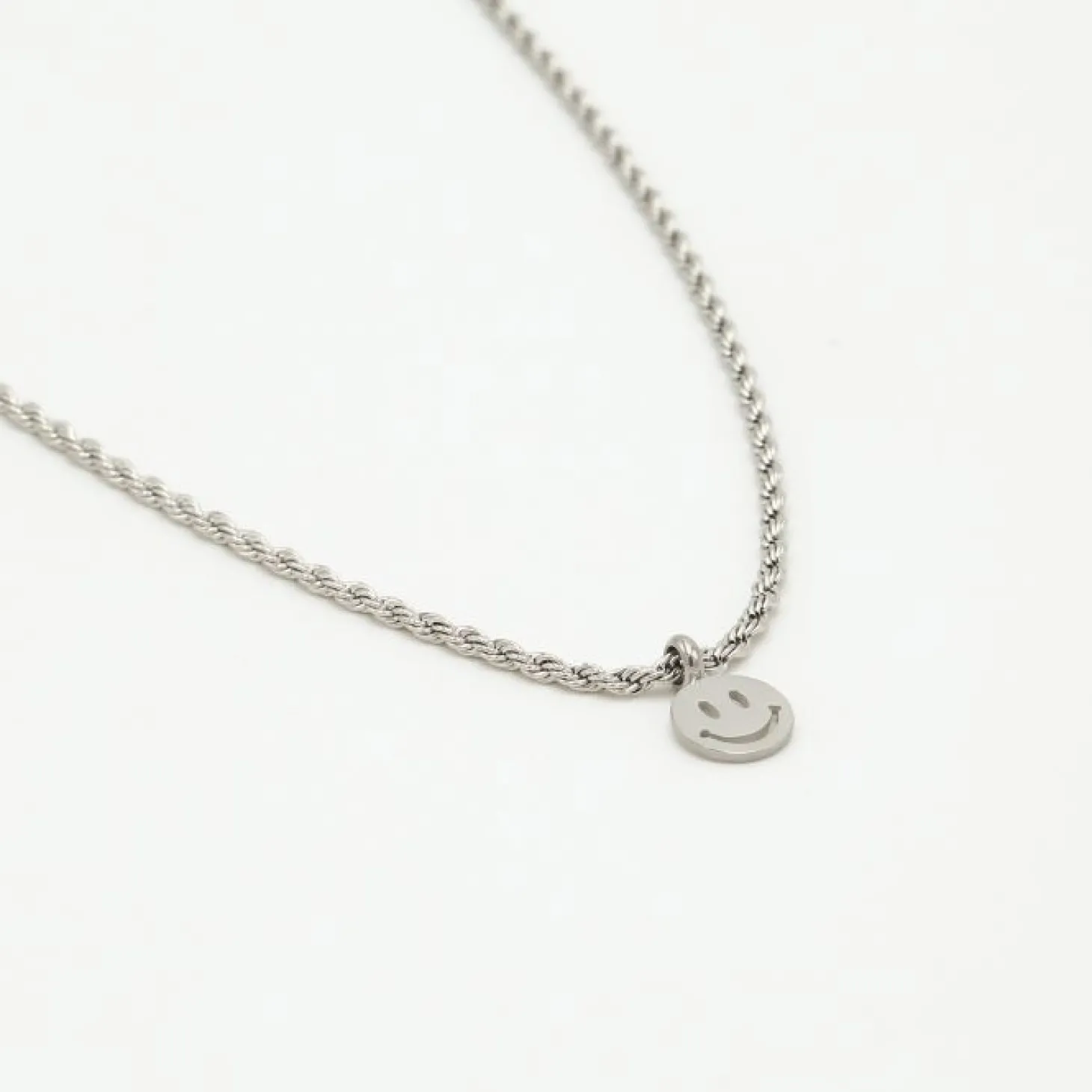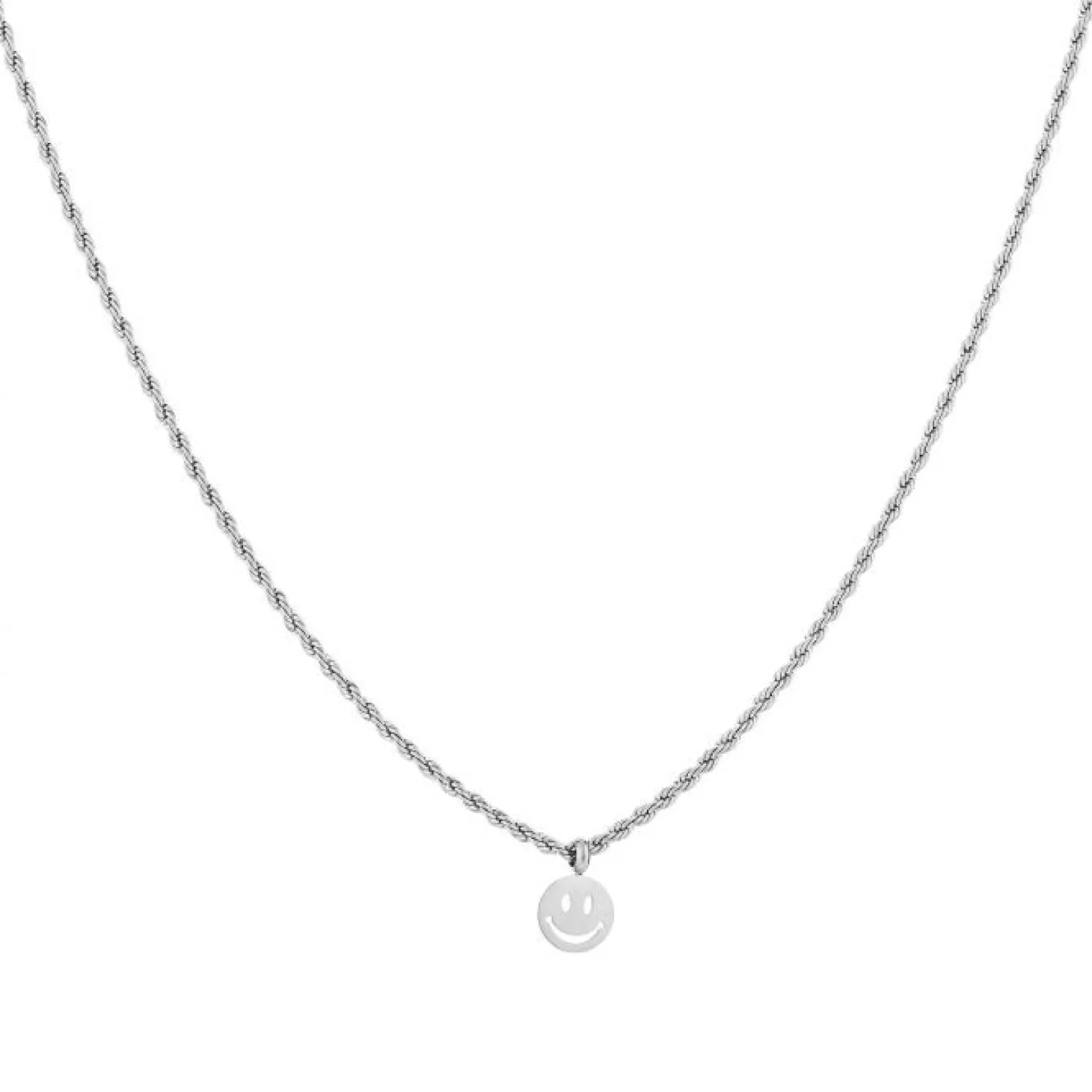 Zilveren gedraaide ketting met smiley hangertje. Lengte 40cm en nog eens te verlengen met 5cm. Gemaakt van hoogwaardig stainless steel.