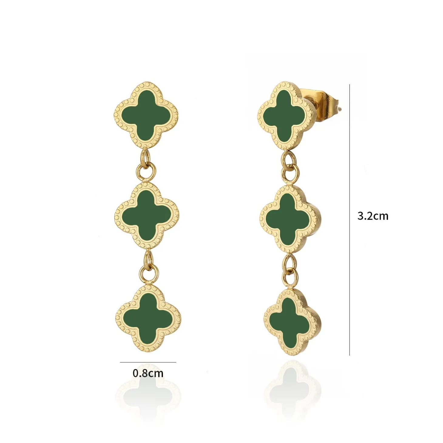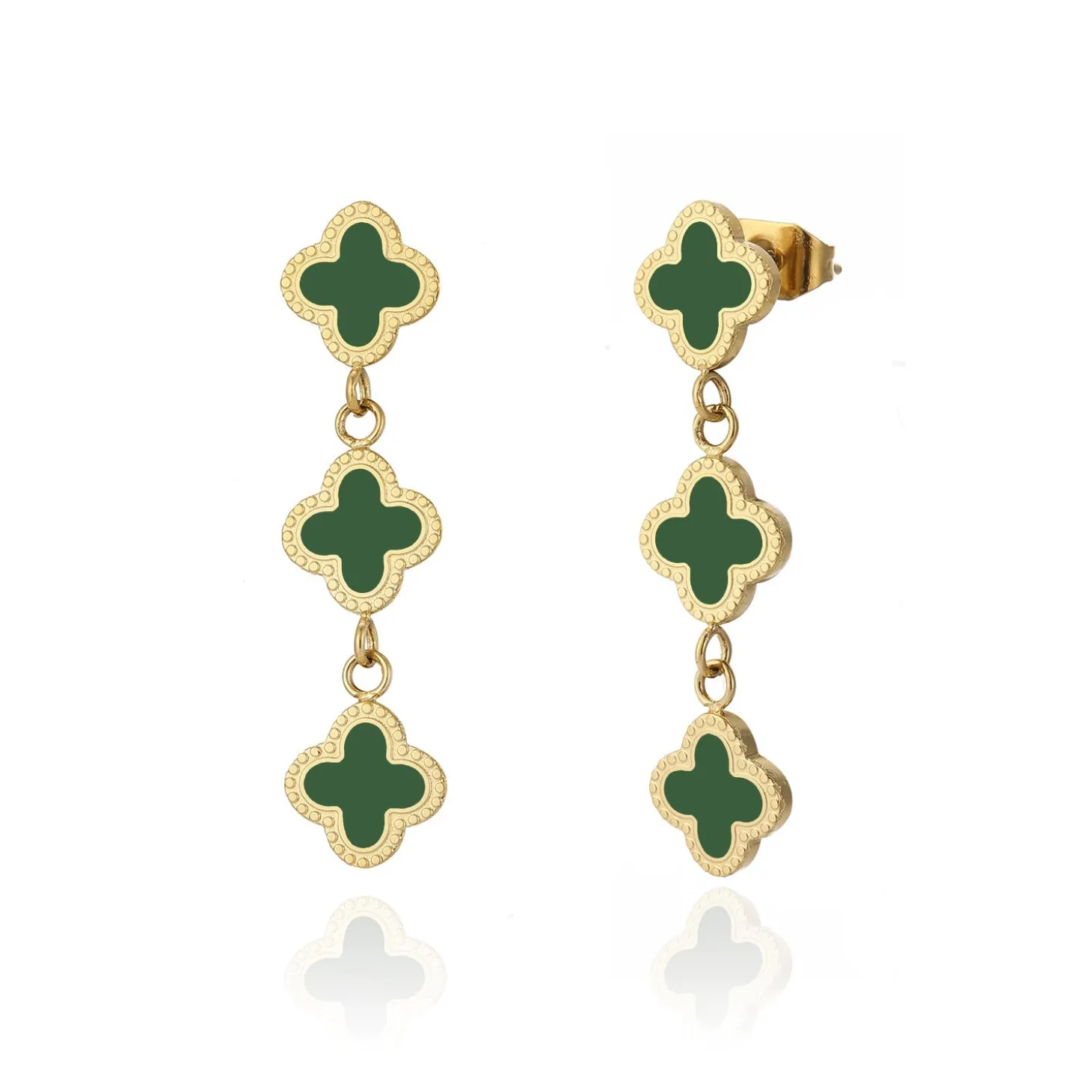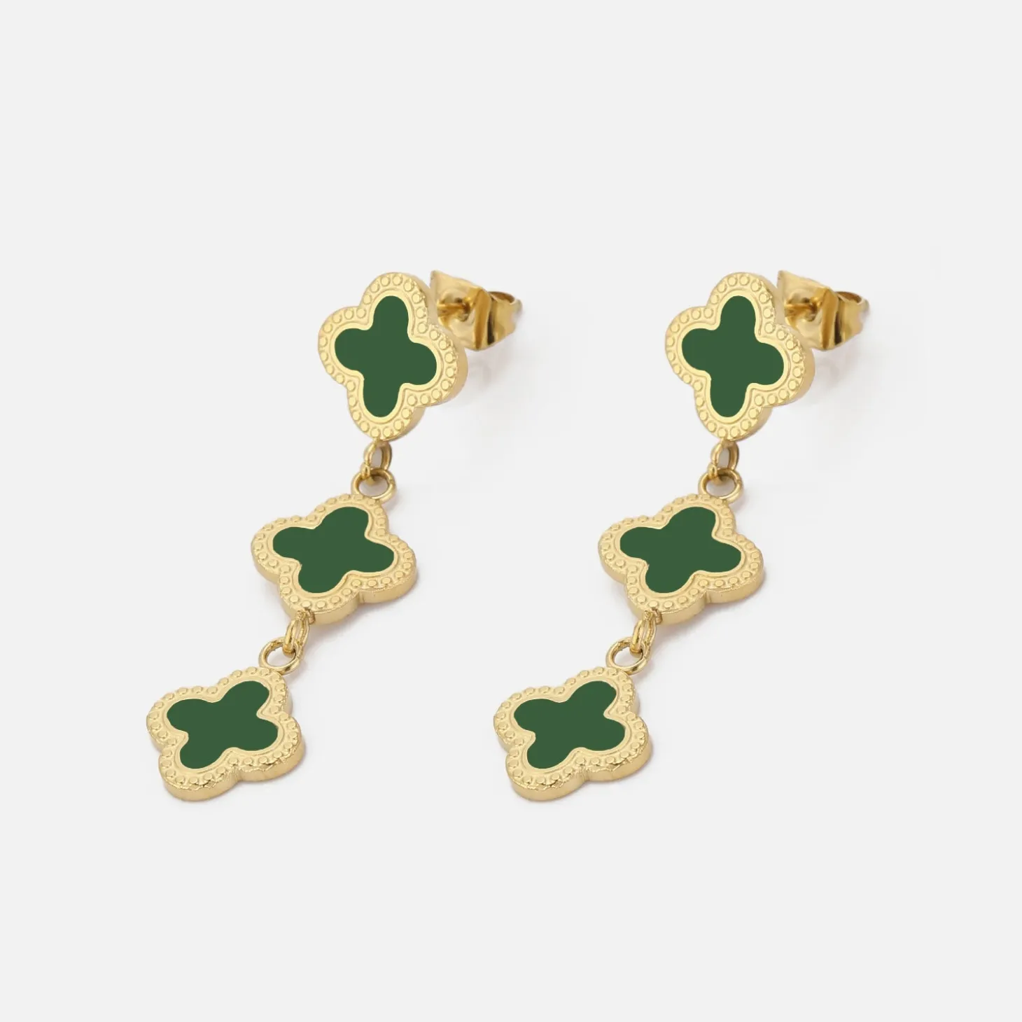 Gouden hangende klavertjevier oorbellen. 3cm lang. Gemaakt van hoogwaardig stainless steel.