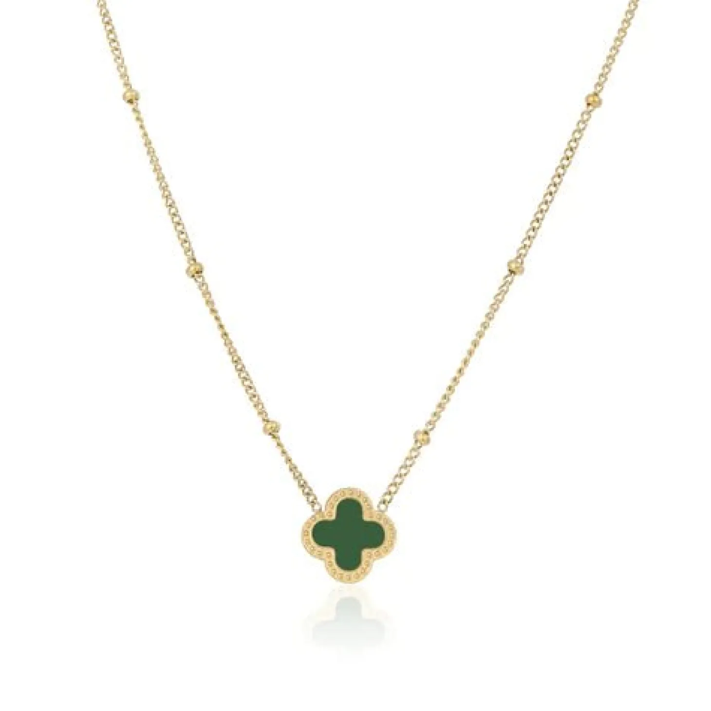 Zilveren ketting met groene klavertje vier. Lengte 40cm en nog eens te verlengen met 5cm. Gemaakt van hoogwaardig stainless steel.