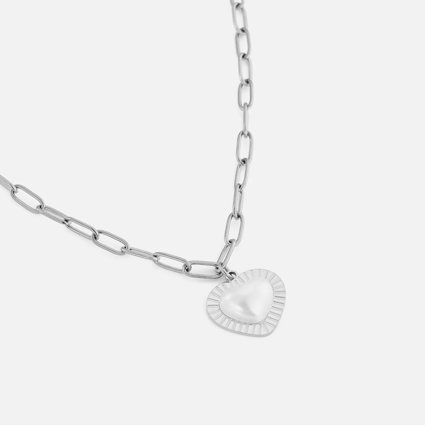 Zilveren ketting met parel hart. Lengte 40cm en nog eens te verlengen met 5cm. Gemaakt van hoogwaardig stainless steel. (let op! parel kan verkleuren met veel contact water)