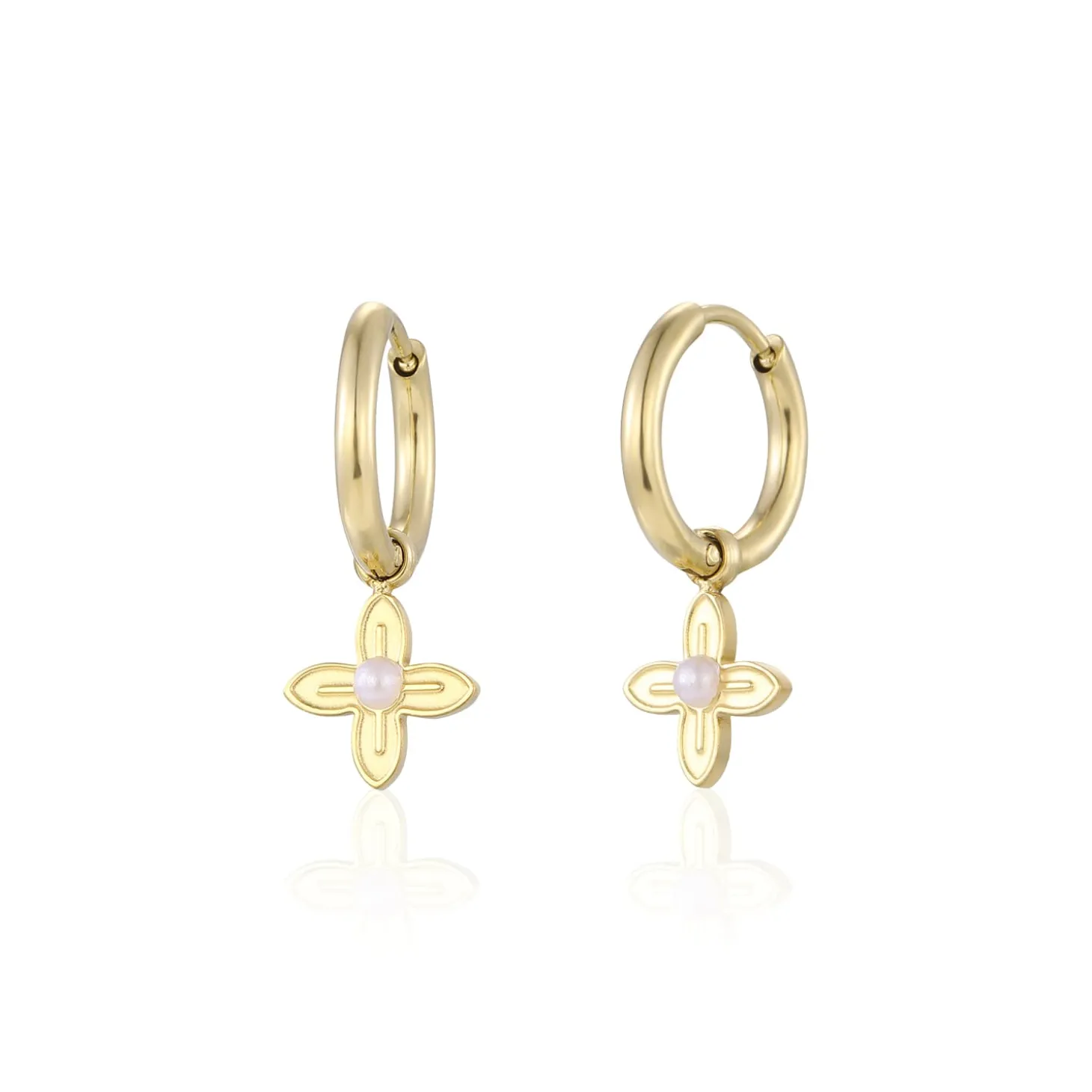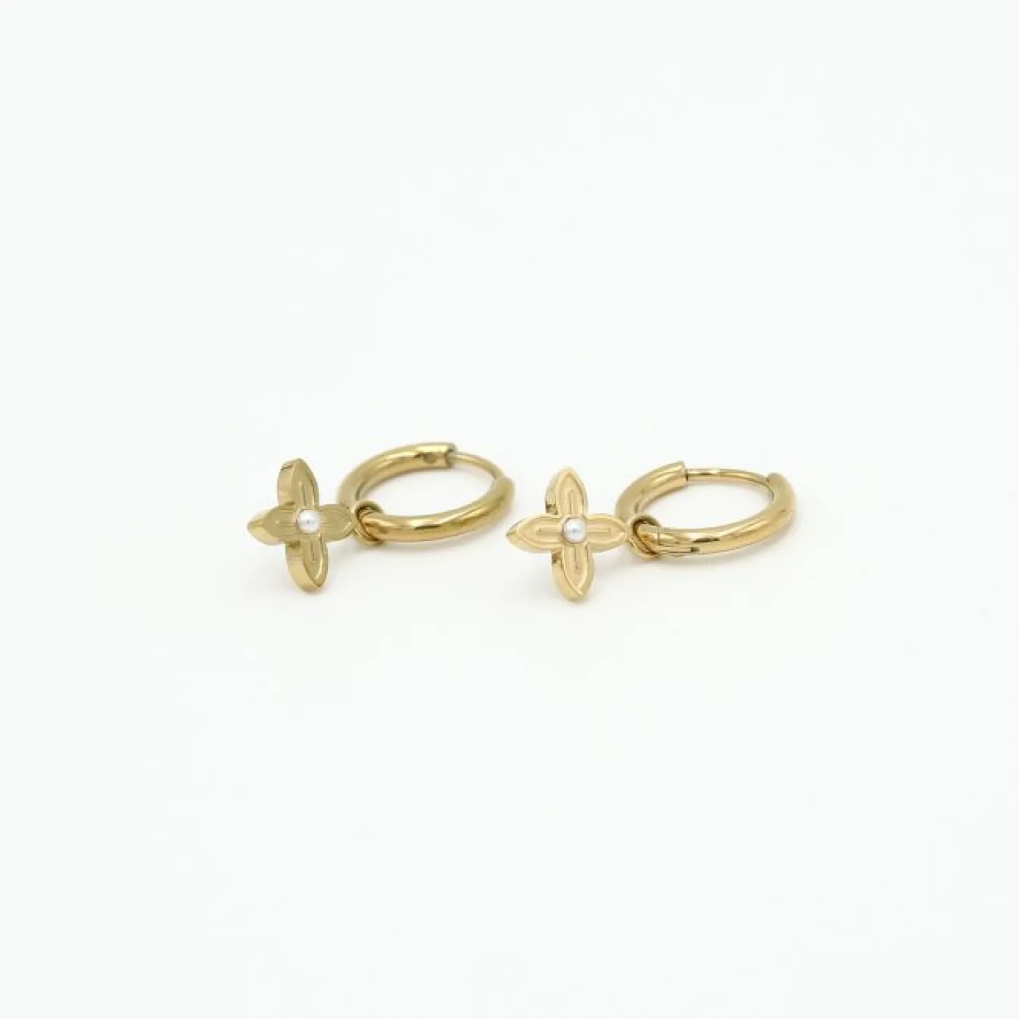 Gouden oorbellen met bloem bedeltje. Deze oorbellen zijn 1.9cm breed. Gemaakt van Hoogwaardig Stainless Steel.