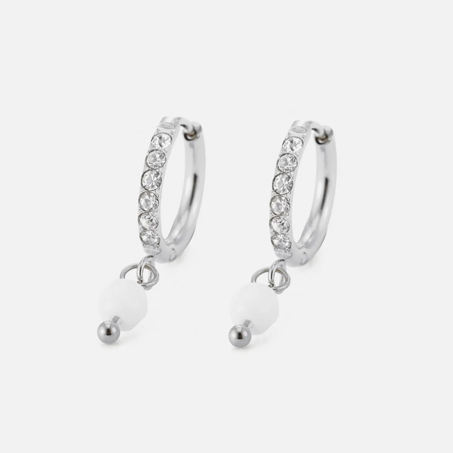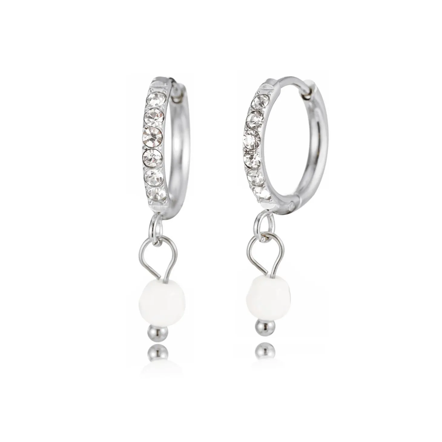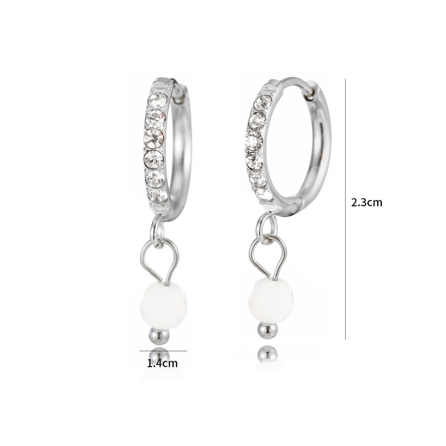 Zilveren oorbellen met witte steentjes. Deze oorbellen zijn 2.3cm lang. Gemaakt van Hoogwaardig Stainless Steel.