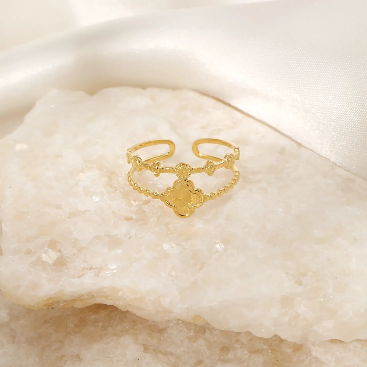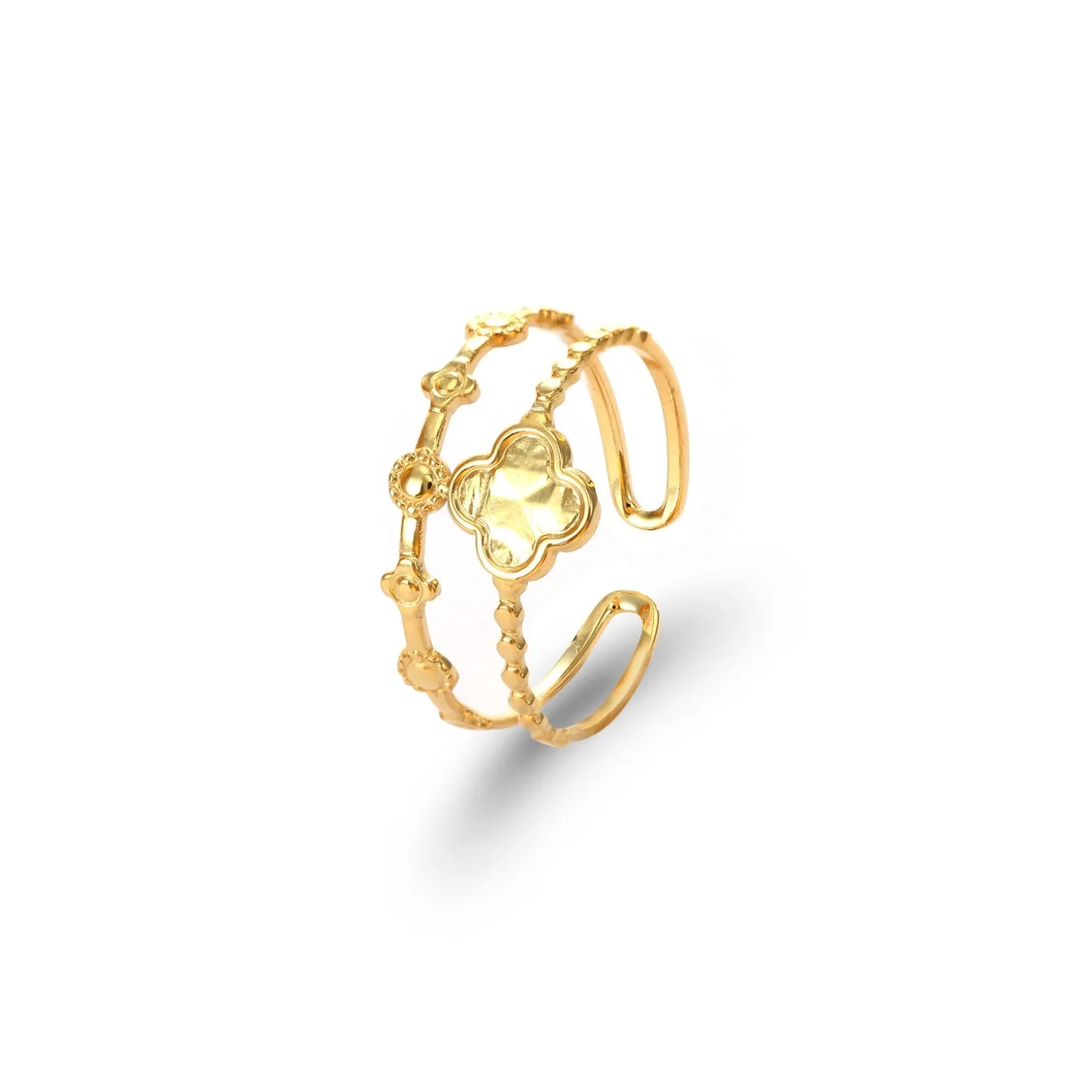 Gouden twee laags klaver ring. Verstelbaar naar jouw gewenste maat. Gemaakt van hoogwaardig stainless steel. Geluk sieraden, klavertjevier sieraden.