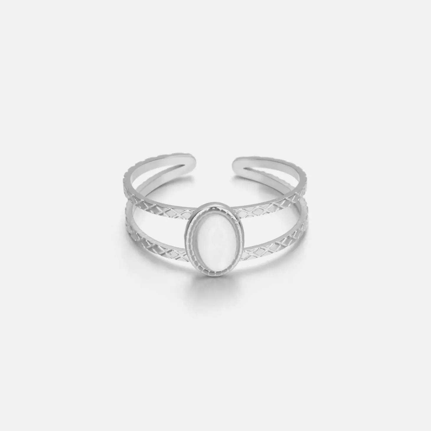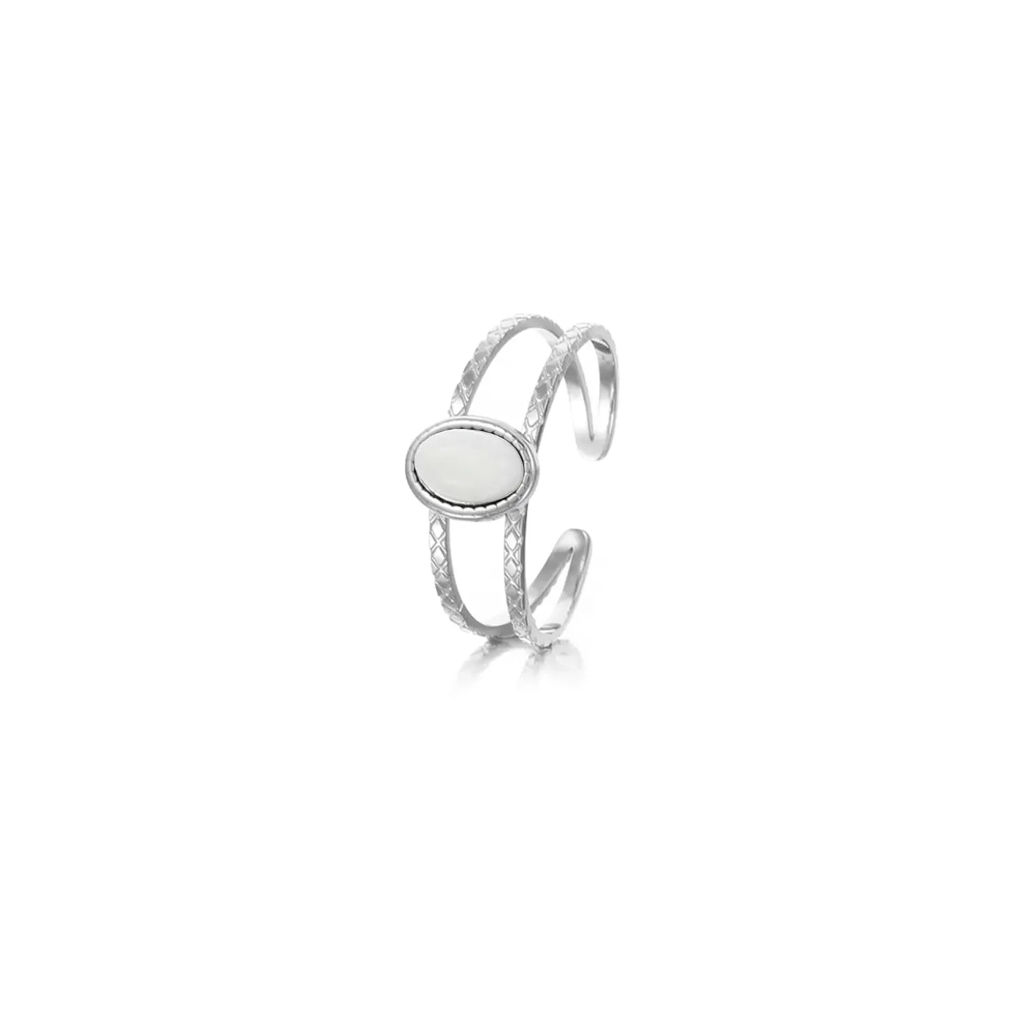 Zilveren ring met witte steen. Ring is verstelbaar naar jouw gewenste maat. Gemaakt van hoogwaardig stainless steel.