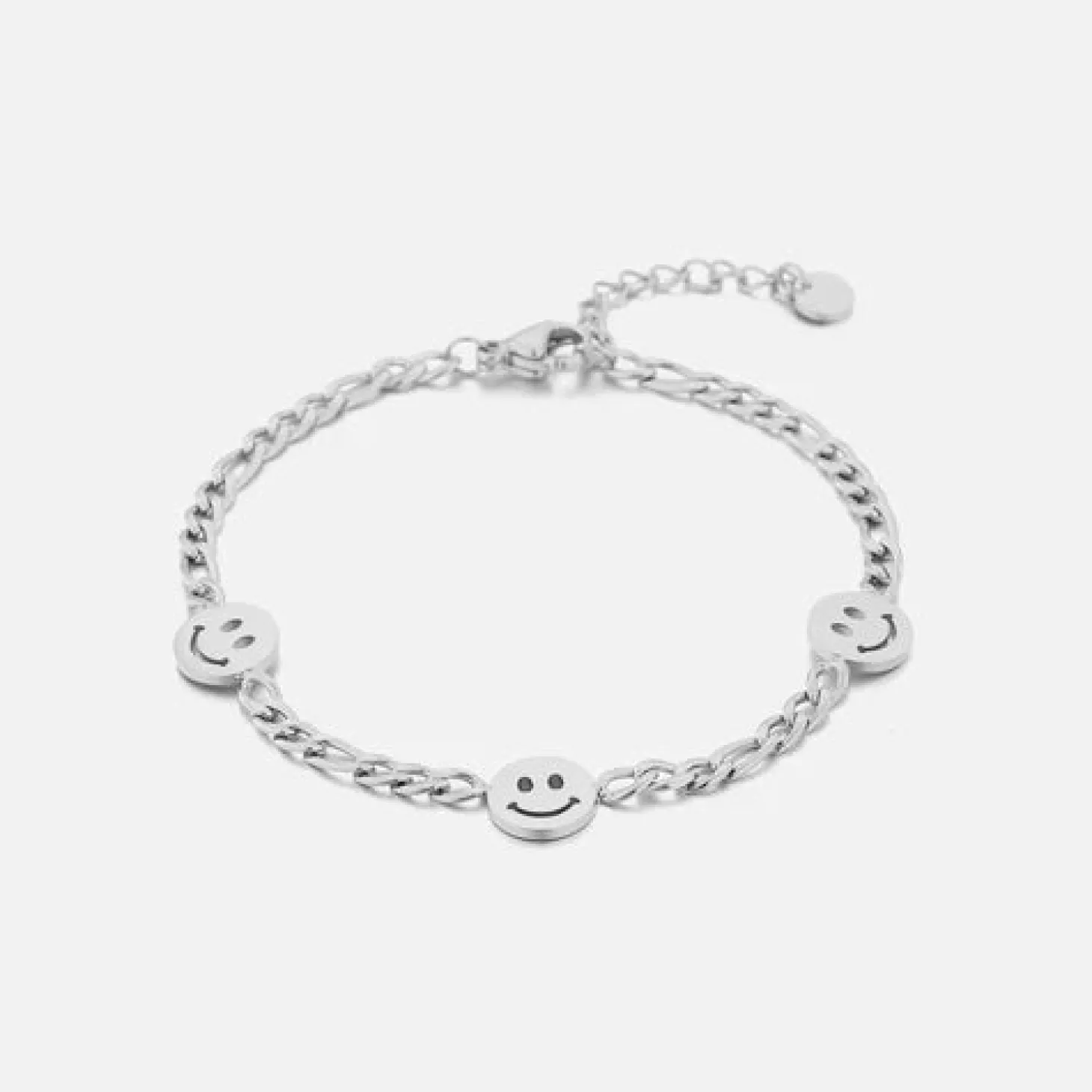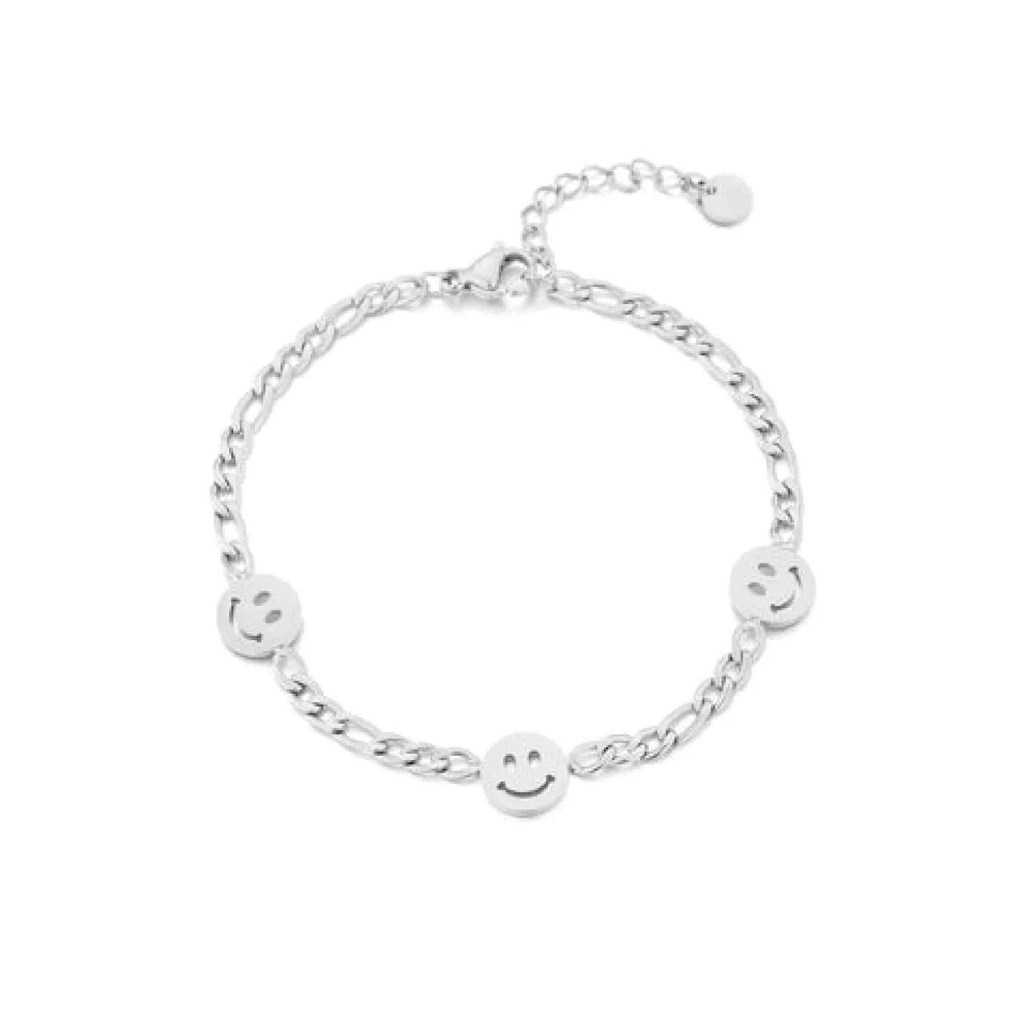 Zilveren schakel armband met drie smileys. 16 cm lang en kan nog eens met 4 cm verlengd worden. Gemaakt van hoogwaardig stainless steel. Dankzij het verlengstukje is de armband verstelbaar en geschikt voor verschillende polsmaten.