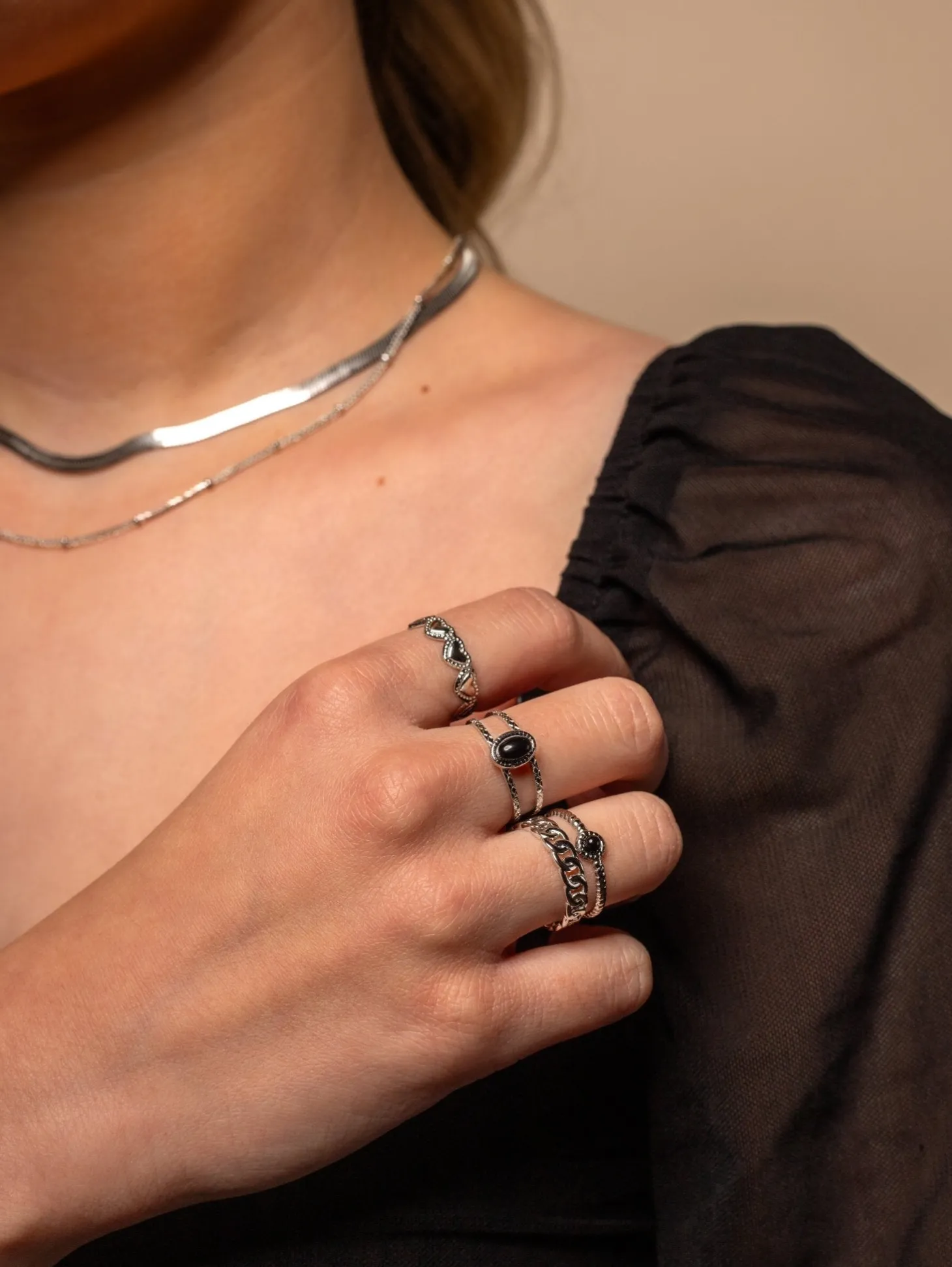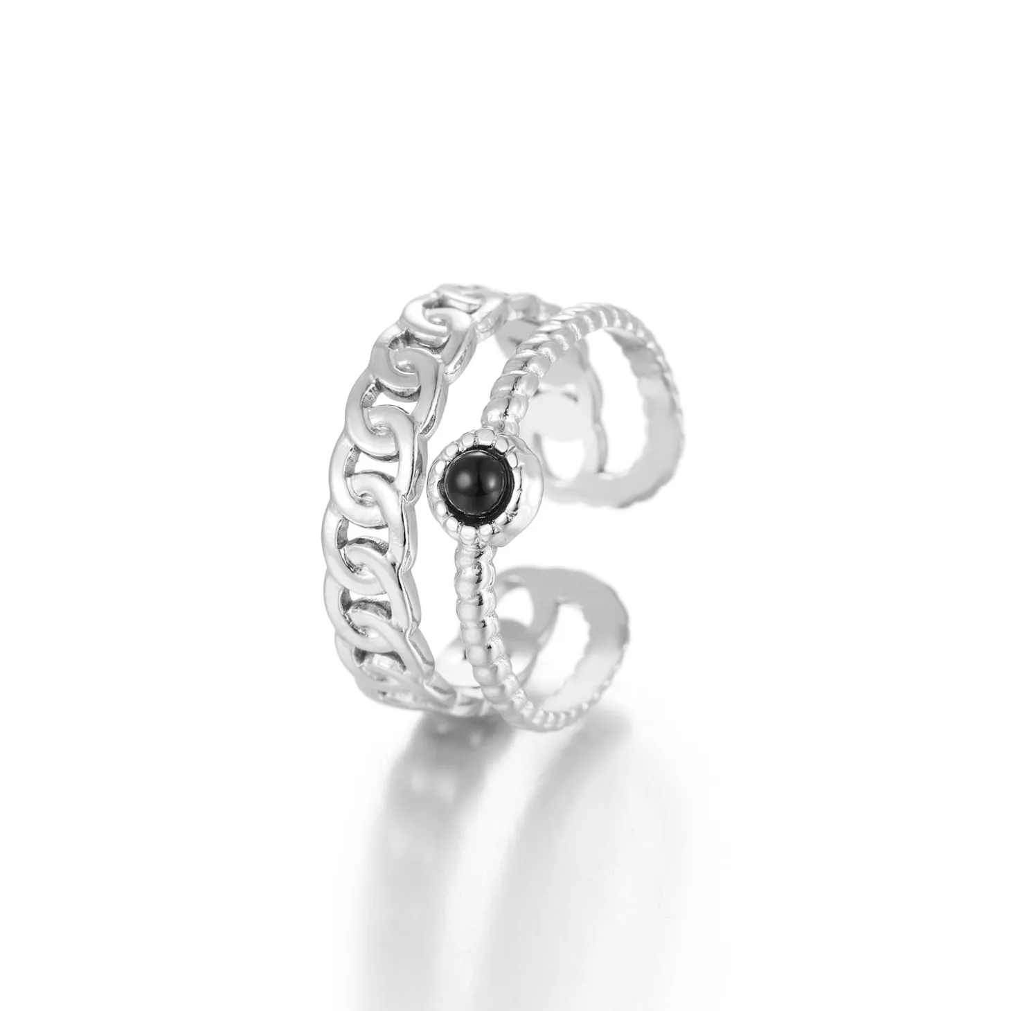 Zilveren twee laags ring met zwarte steen. Verstelbaar naar jouw gewenste maat. Gemaakt van hoogwaardig stainless steel.