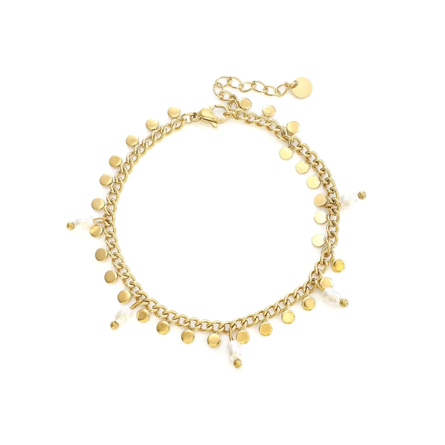 Armband met muntjes en parels. 16 cm lang en kan nog eens met 4 cm verlengd worden. Gemaakt van hoogwaardig stainless steel. Dankzij het verlengstukje is de armband verstelbaar en geschikt voor verschillende polsmaten. (let op! parels kunnen verkleuren door contact met water)