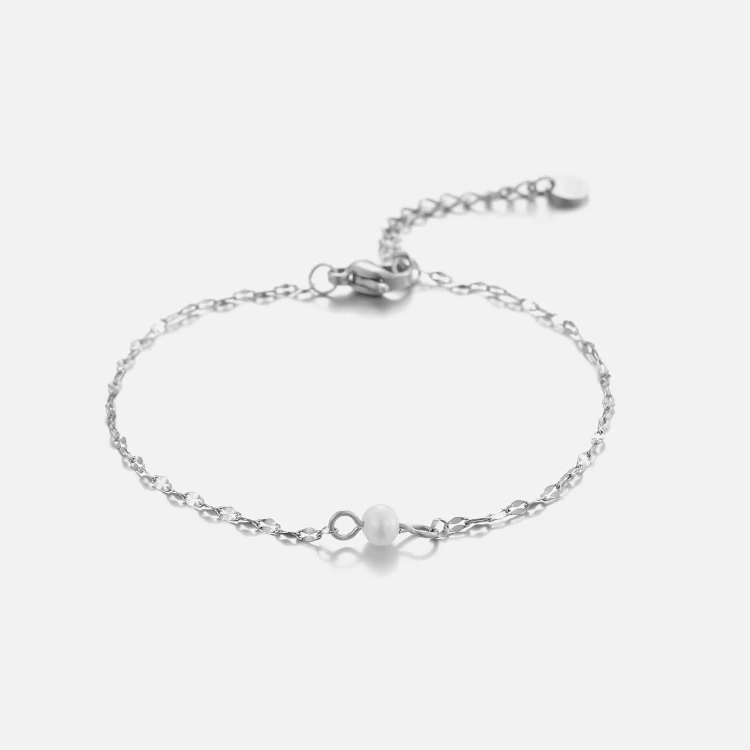 Armband fijne schakel met pareltje. 16 cm lang en kan nog eens met 4 cm verlengd worden. Gemaakt van hoogwaardig stainless steel. Dankzij het verlengstukje is de armband verstelbaar en geschikt voor verschillende polsmaten. (Let op! parel kan verkleuren door aanraking water)