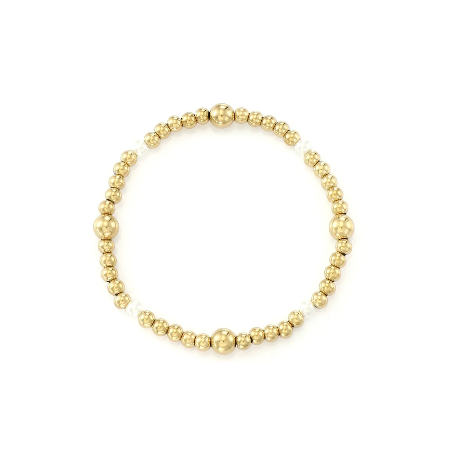 Stretch armband met balletjes en parel. 16cm tot 20cm lang te stretchen. Gemaakt van hoogwaardig stainless steel. Door het elastiek is de armband verstelbaar en geschikt voor verschillende polsmaten. Zeer goed te combineren met andere stretch armbanden. (bekijk ze hier) (Let op! de parel kan verkleuren door aanraking water)