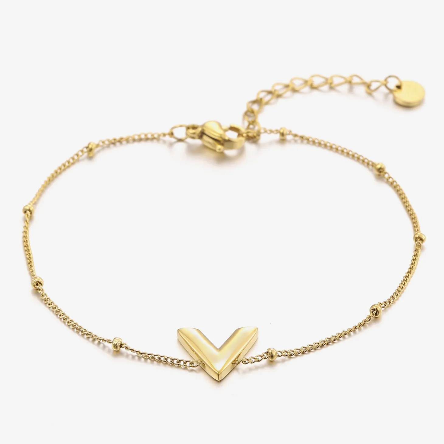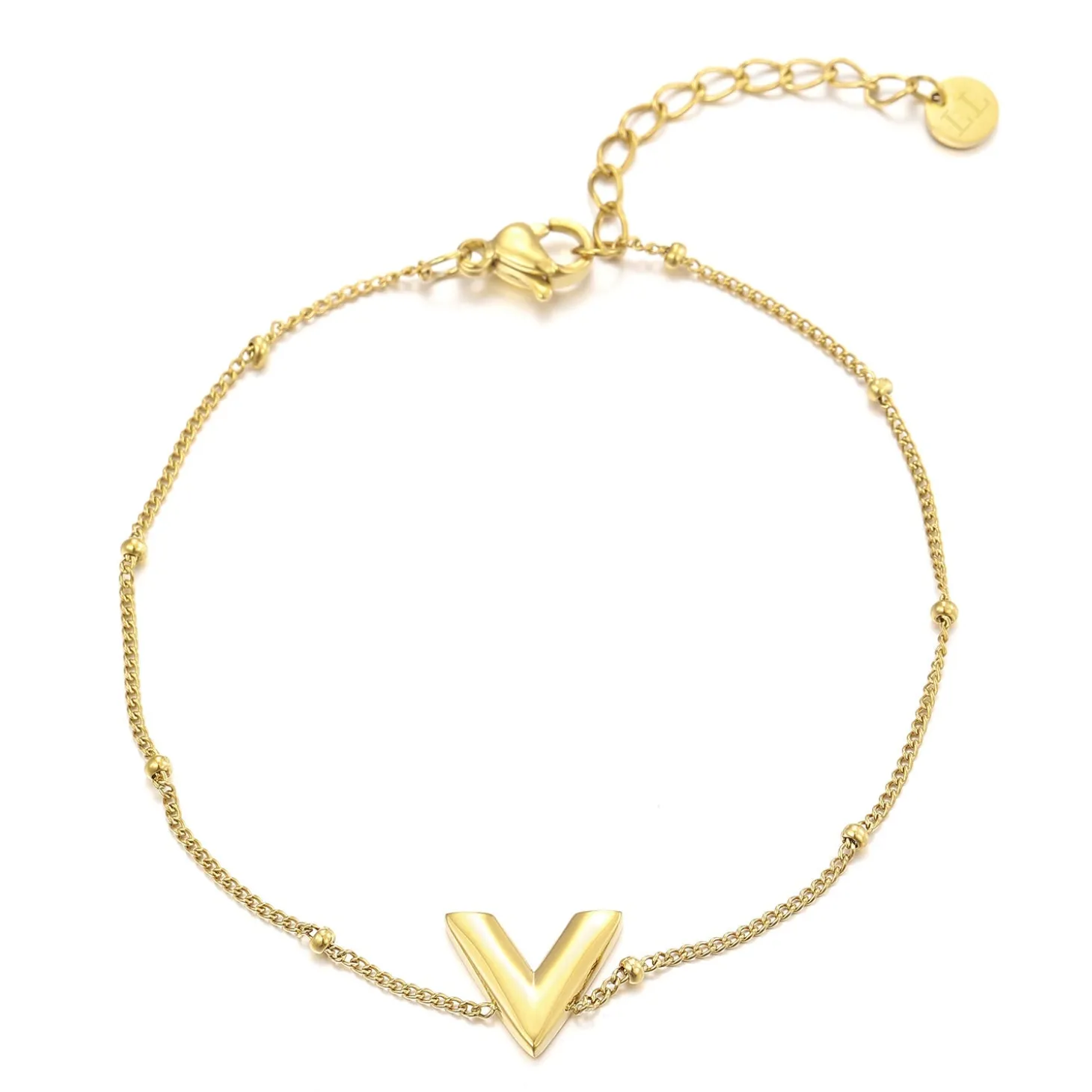 V armband met fijne schakel. 16cm met verlengstukje 4cm. Gemaakt van hoogwaardig stainless steel. De V is 9mm. door het verlengstukje is de armband geschikt voor verschillende polsmaten.
