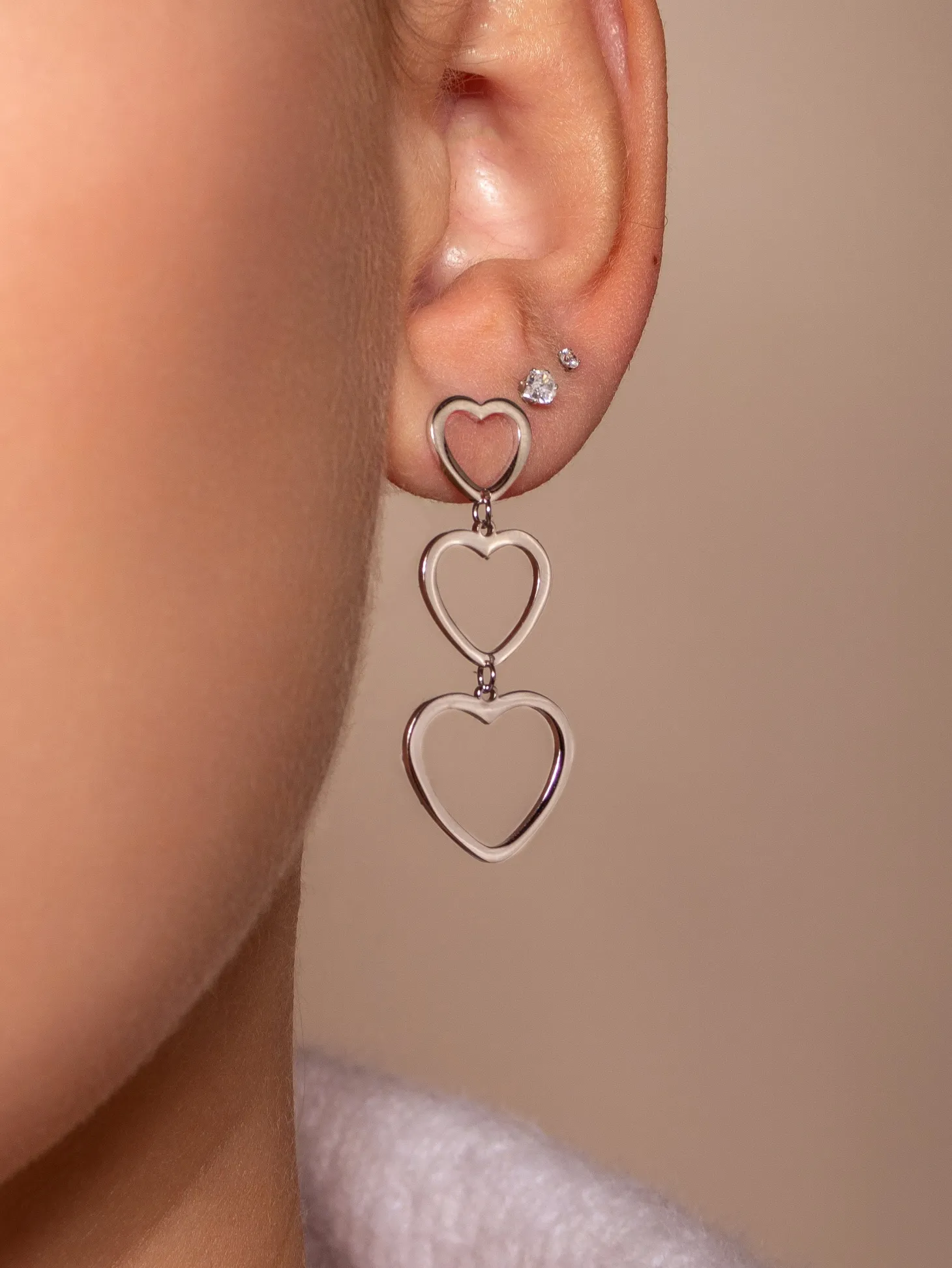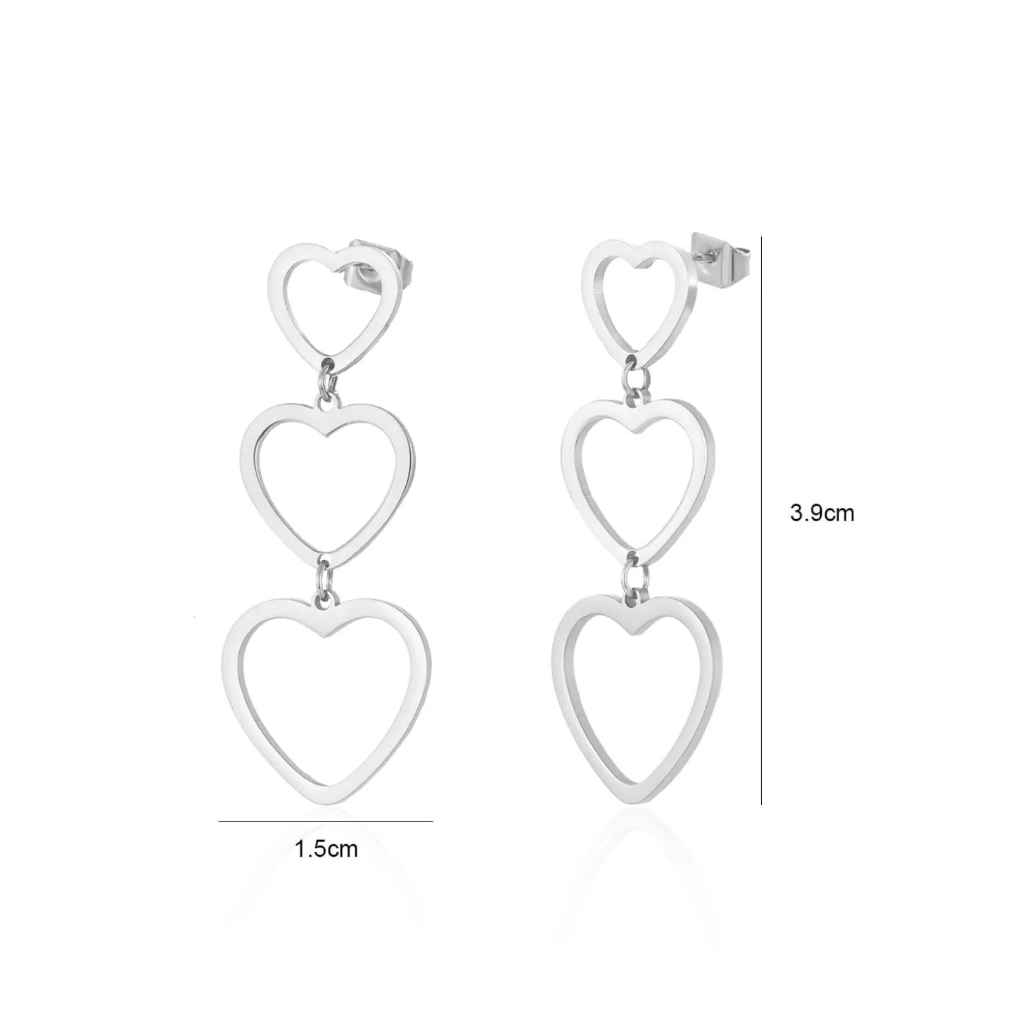 Zilveren oorbellen met hangende hartjes. 4 cm lang. Gemaakt van Hoogwaardig stainless steel. Het grootste hartje is ongeveer 1.5 cm breed.