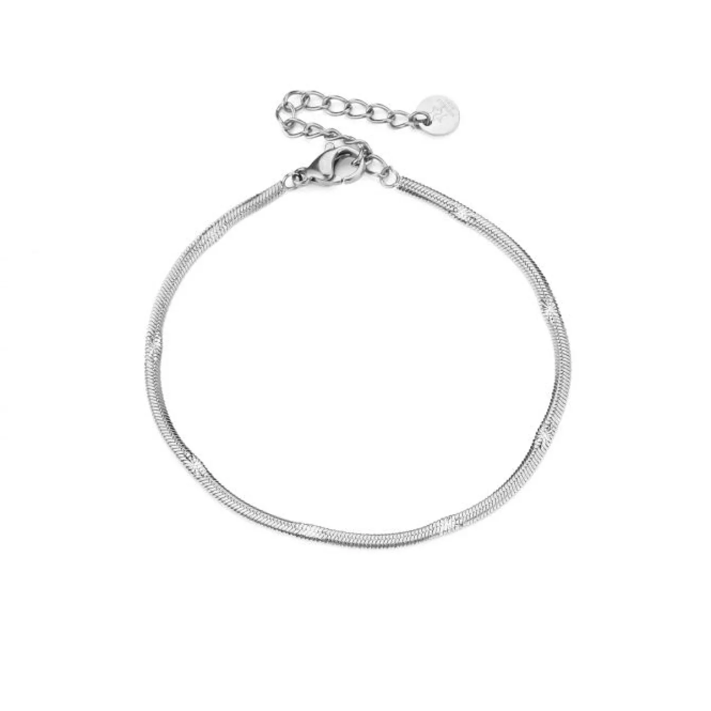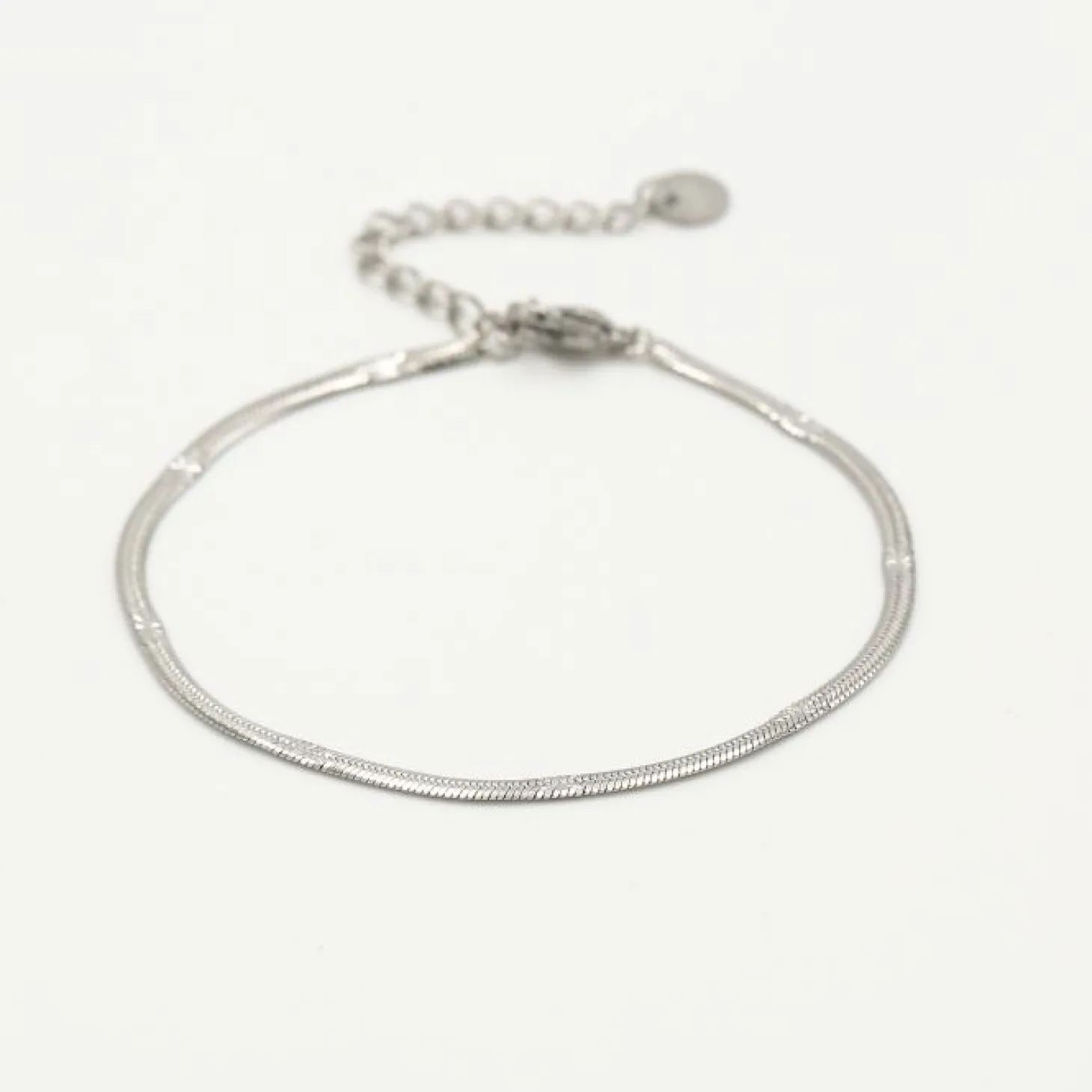 Zilveren dunne armband. 16 cm lang en kan nog eens met 4 cm verlengd worden. Dikte van de armband is 2mm. Gemaakt van hoogwaardig stainless steel. Dankzij het verlengstukje is de armband verstelbaar en geschikt voor verschillende polsmaten. goed te combineren met andere zilverkleurige sieraden.