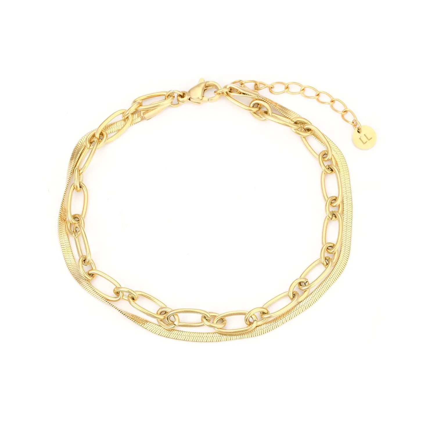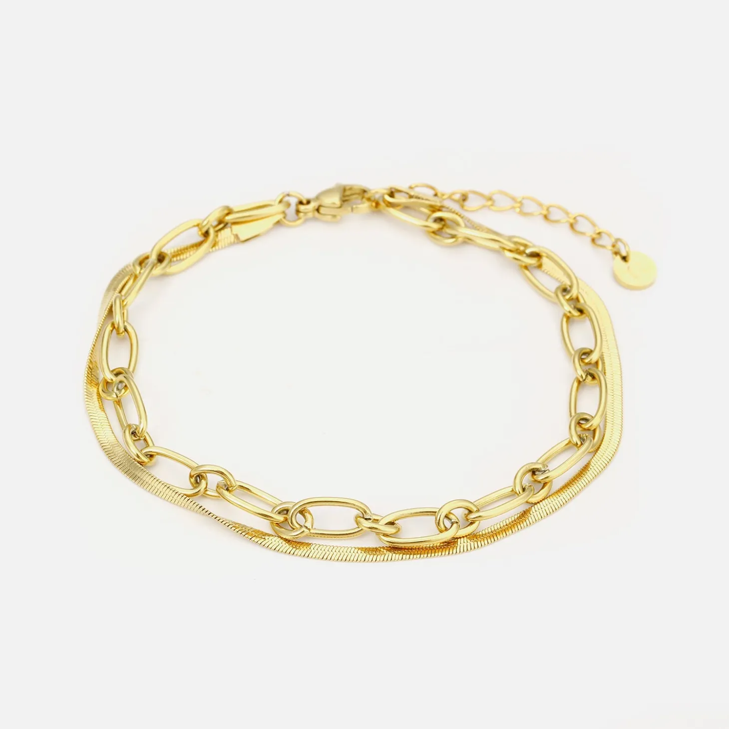 Goud twee laags plat schakel armband. Lengte is 16cm + 4cm verlengstukje. Gemaakt van hoogwaardig stainless steel. Deze armband kun je vol hangen met bedeltjes uit de ontwerp je eigen sieraden collectie. (design your own) De bedeltjes zijn te combineren met zowel armband, ketting & oorbellen.