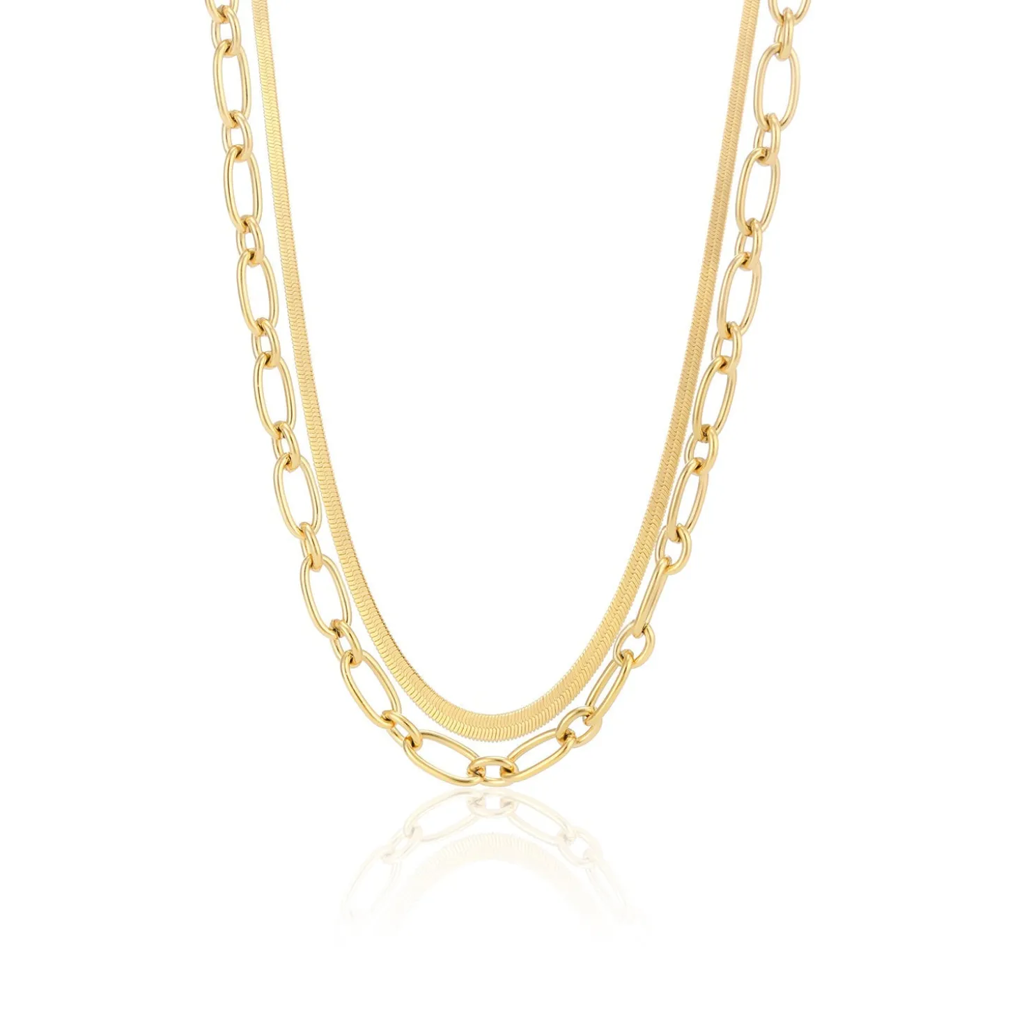 Goud twee laags platte schakel ketting. Lengte is 40cm + 5cm verlengstukje. Gemaakt van hoogwaardig stainless steel. Deze ketting kun je vol hangen met bedeltjes uit de ontwerp je eigen sieraden collectie. (design your own) De bedeltjes zijn te combineren met zowel armband, ketting & oorbellen.