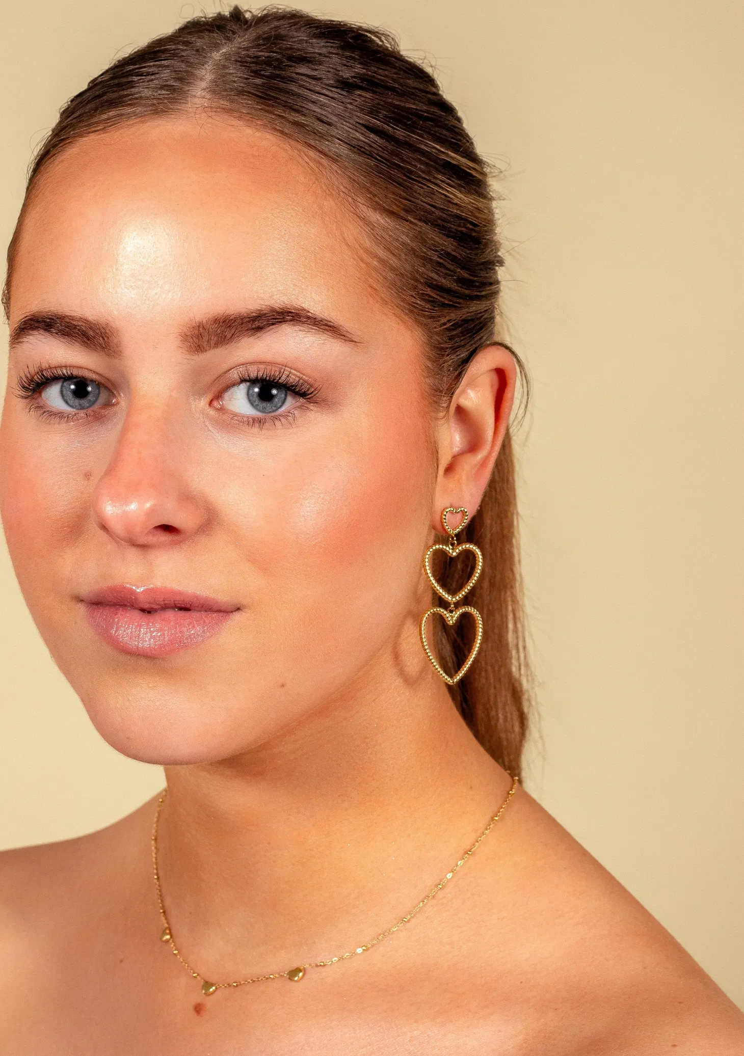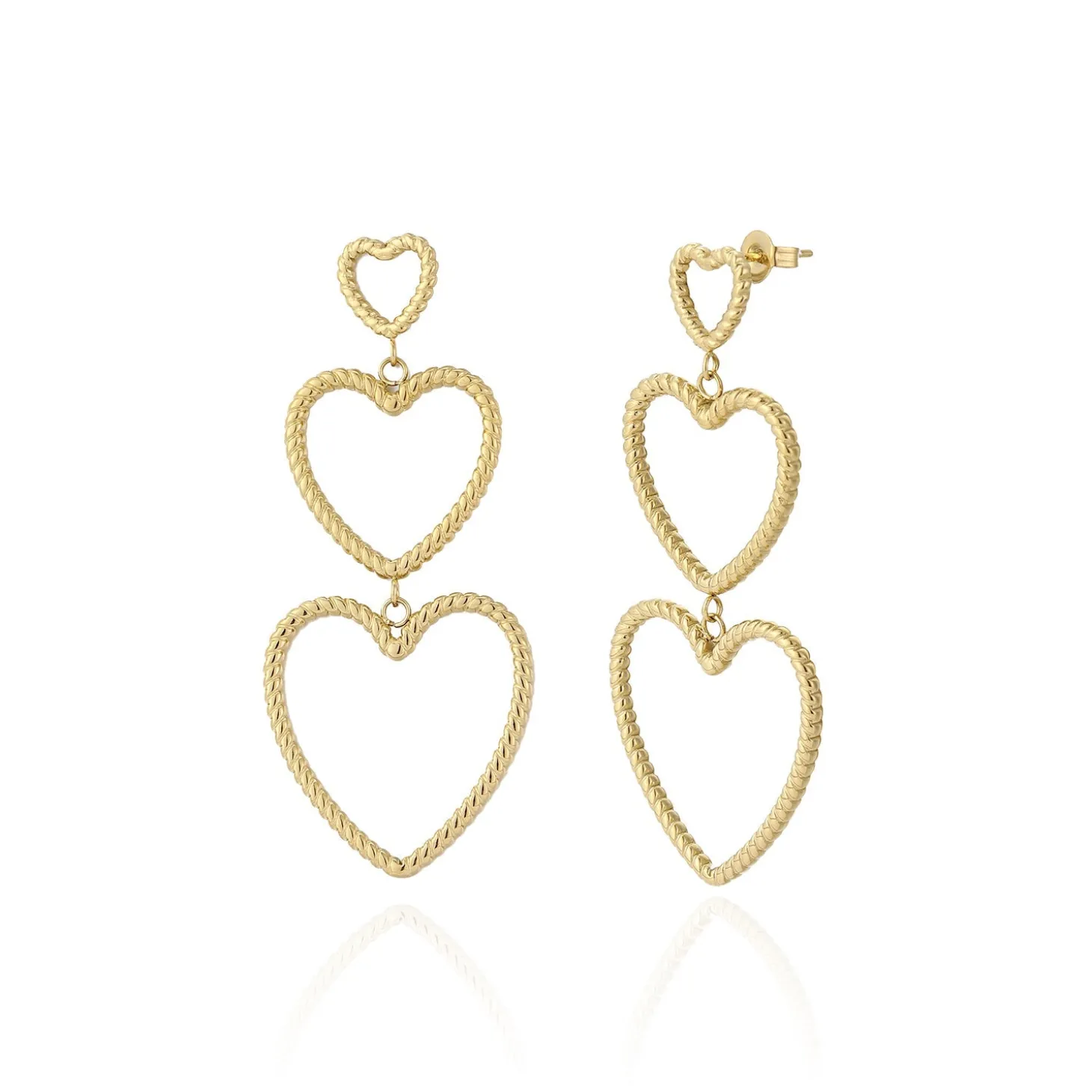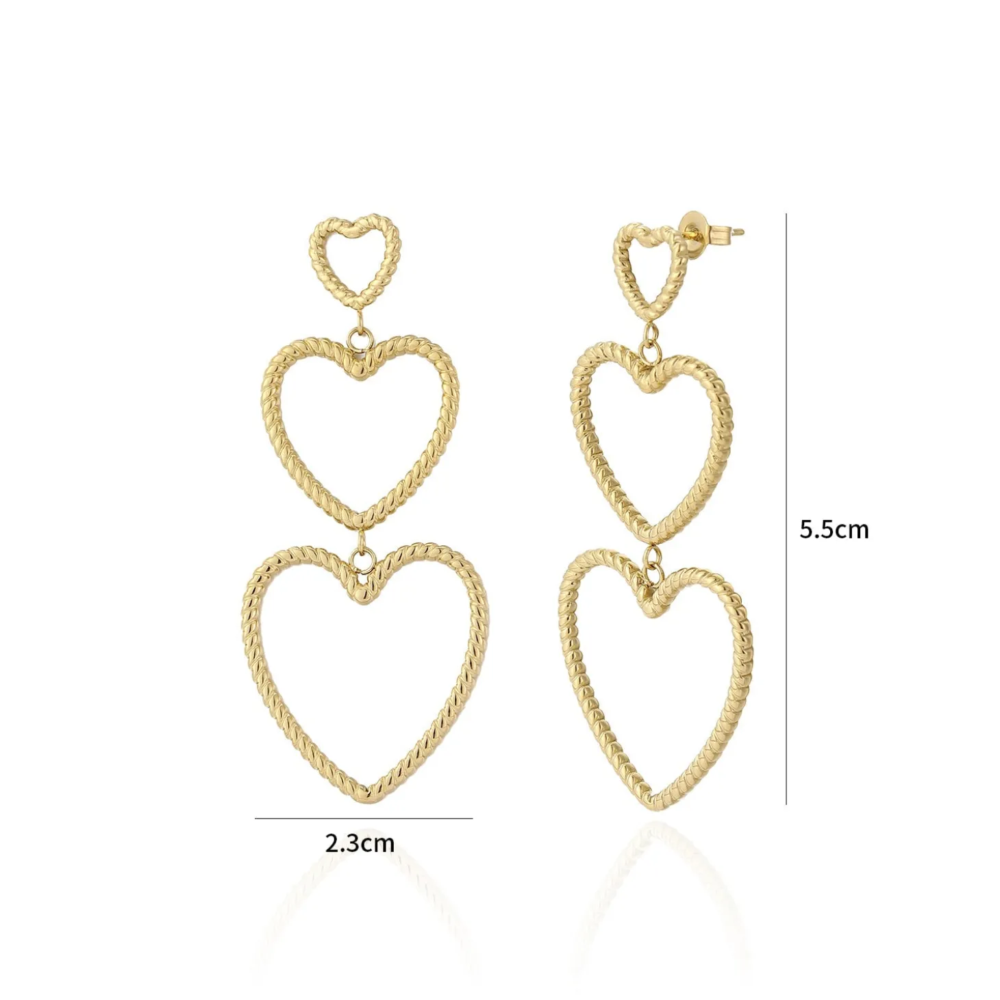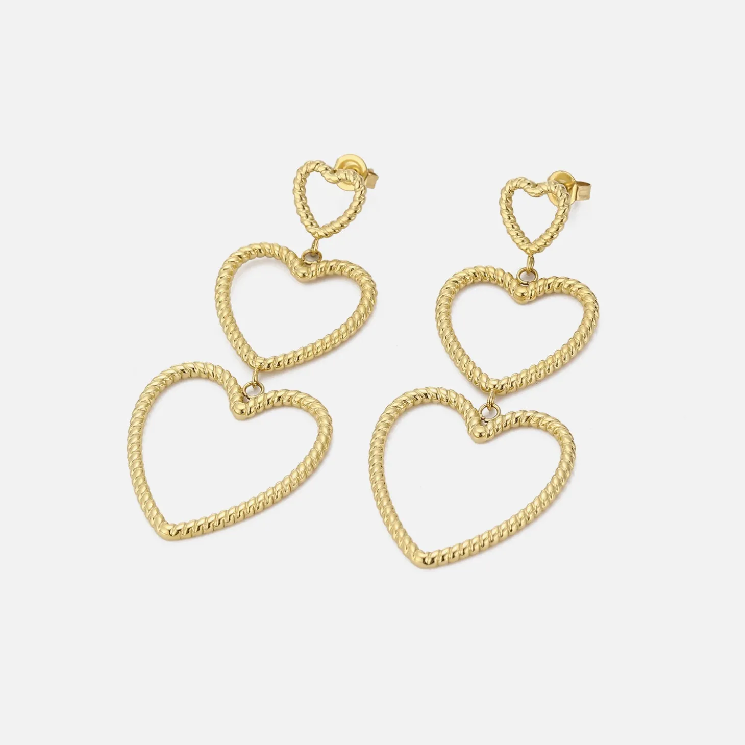 Gouden hangende hartjes groot naar klein. Deze oorbellen zijn 5,5 cm lang. Het grootste hartje is 2,3 cm breed. Gemaakt van hoogwaardig stainless steel.