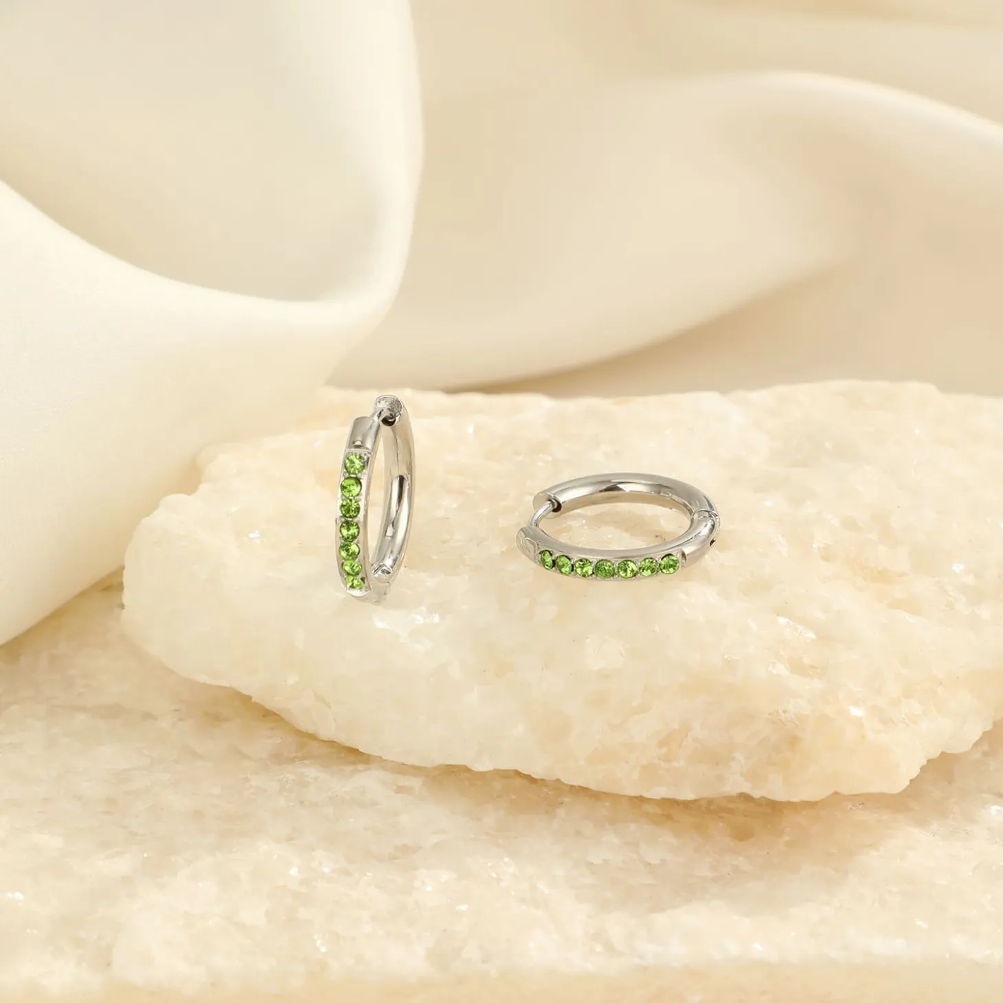 Zilveren Hoops met groene steentjes. De oorbel is 1.6cm breed. Gemaakt van hoogwaardig stainless steel.