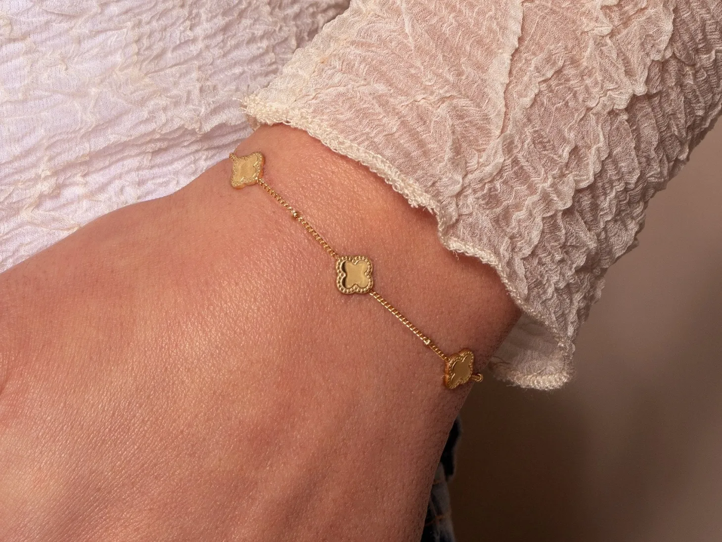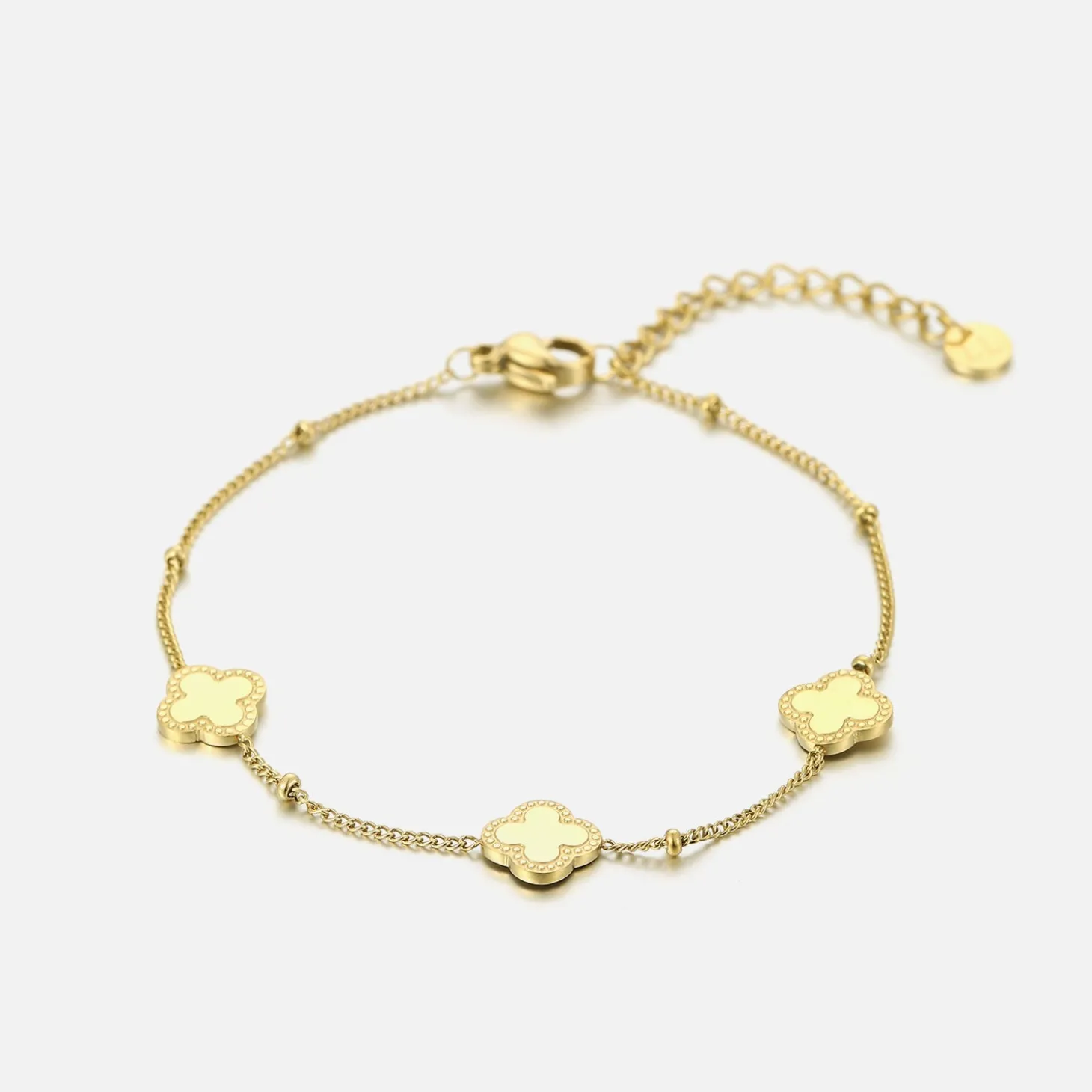Armband goud met drie klavertjesvier. 16 cm lang en kan nog eens met 4 cm verlengd worden. Gemaakt van hoogwaardig stainless steel. Dankzij het verlengstukje is de armband verstelbaar en geschikt voor verschillende polsmaten.