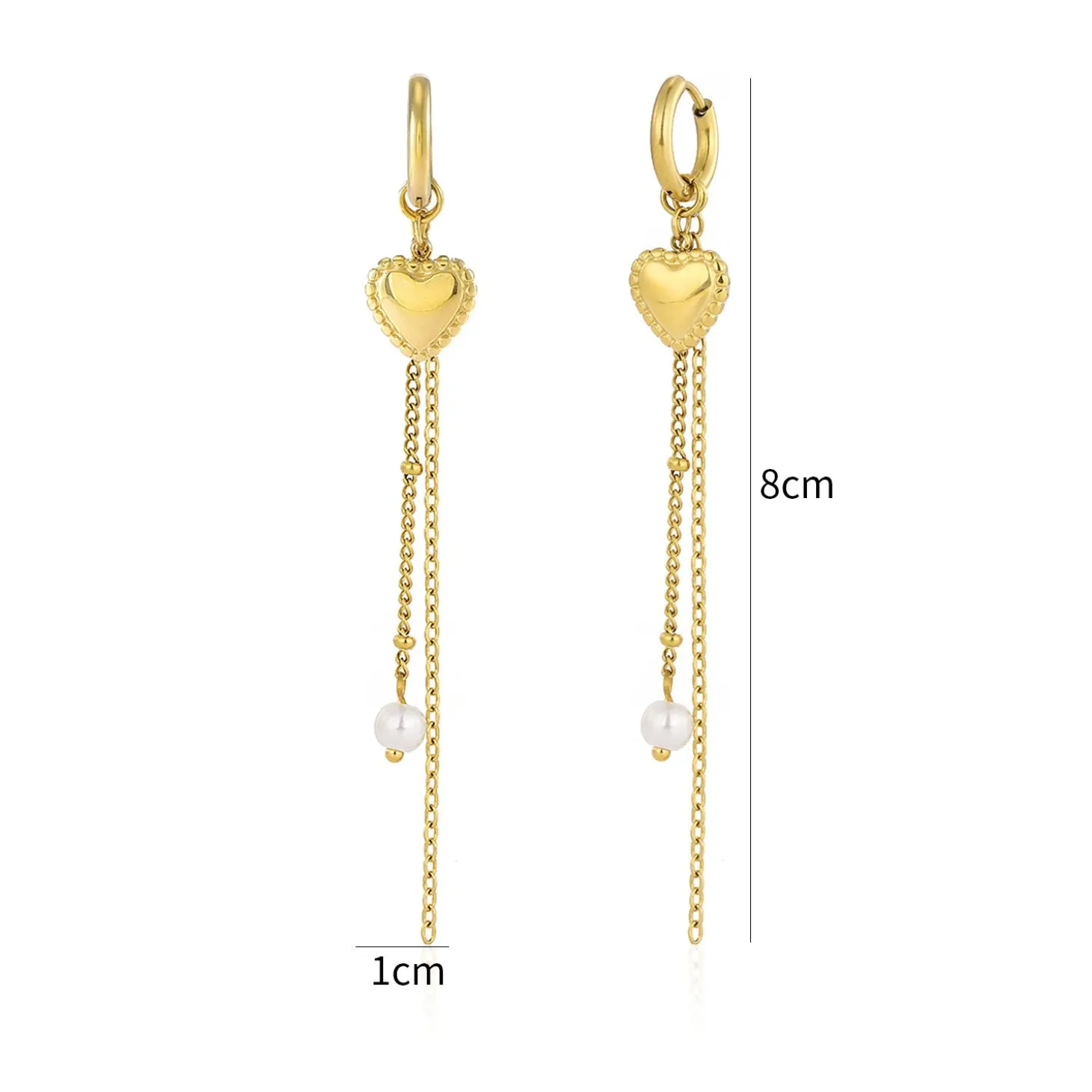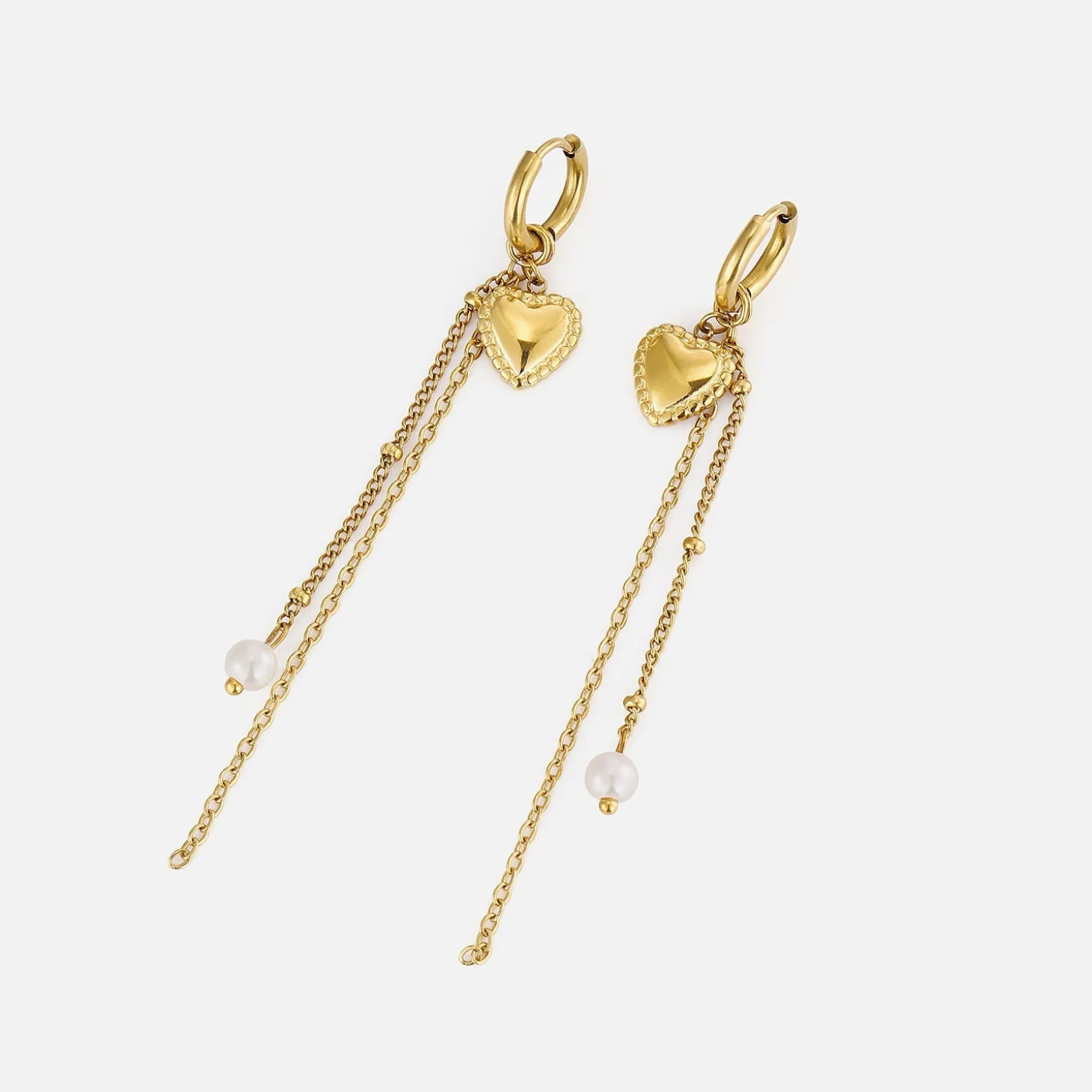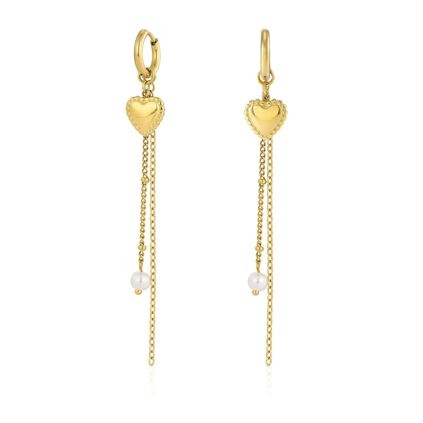 Gouden hangende oorbellen met hartje en ketting. Deze oorbellen zijn 8cm lang en 1cm breed. Gemaakt van Hoogwaardig Stainless Steel.