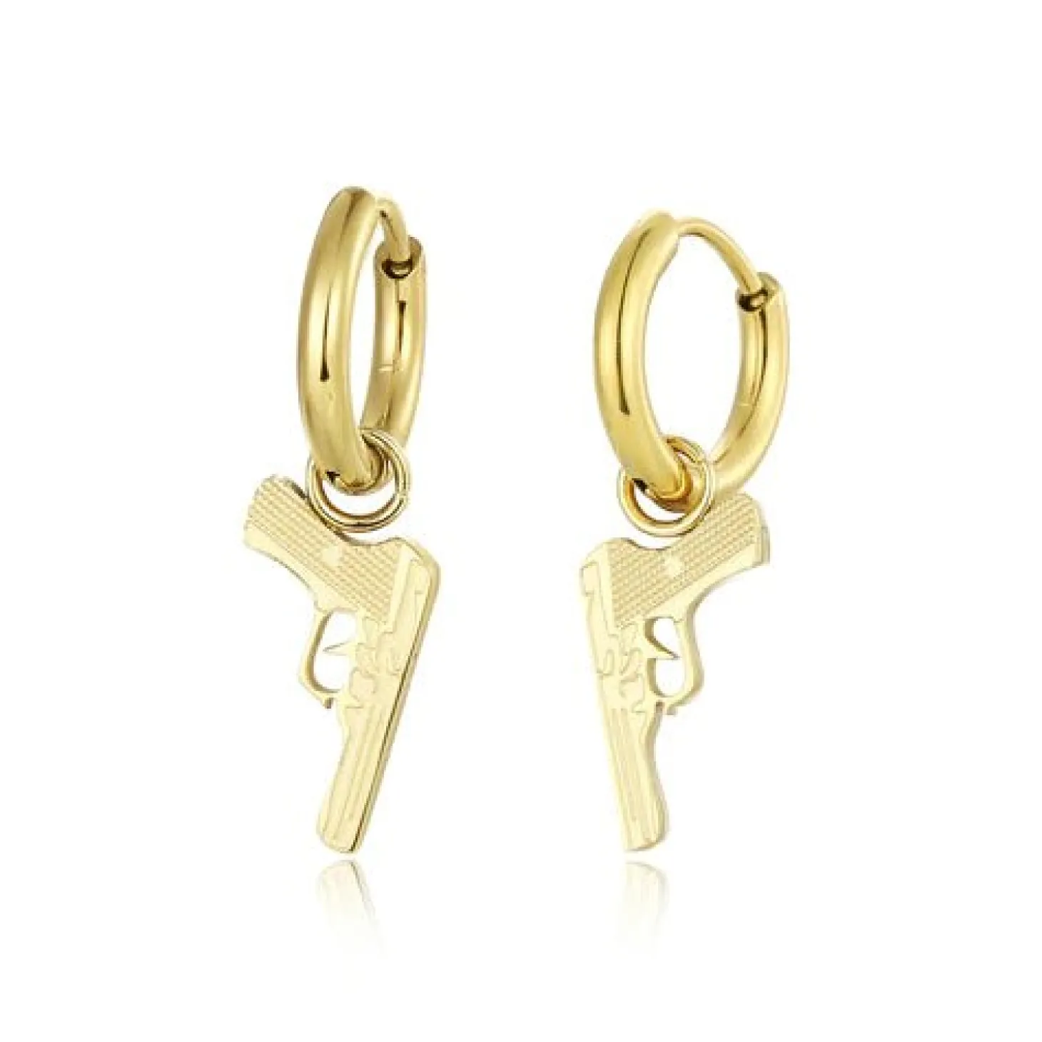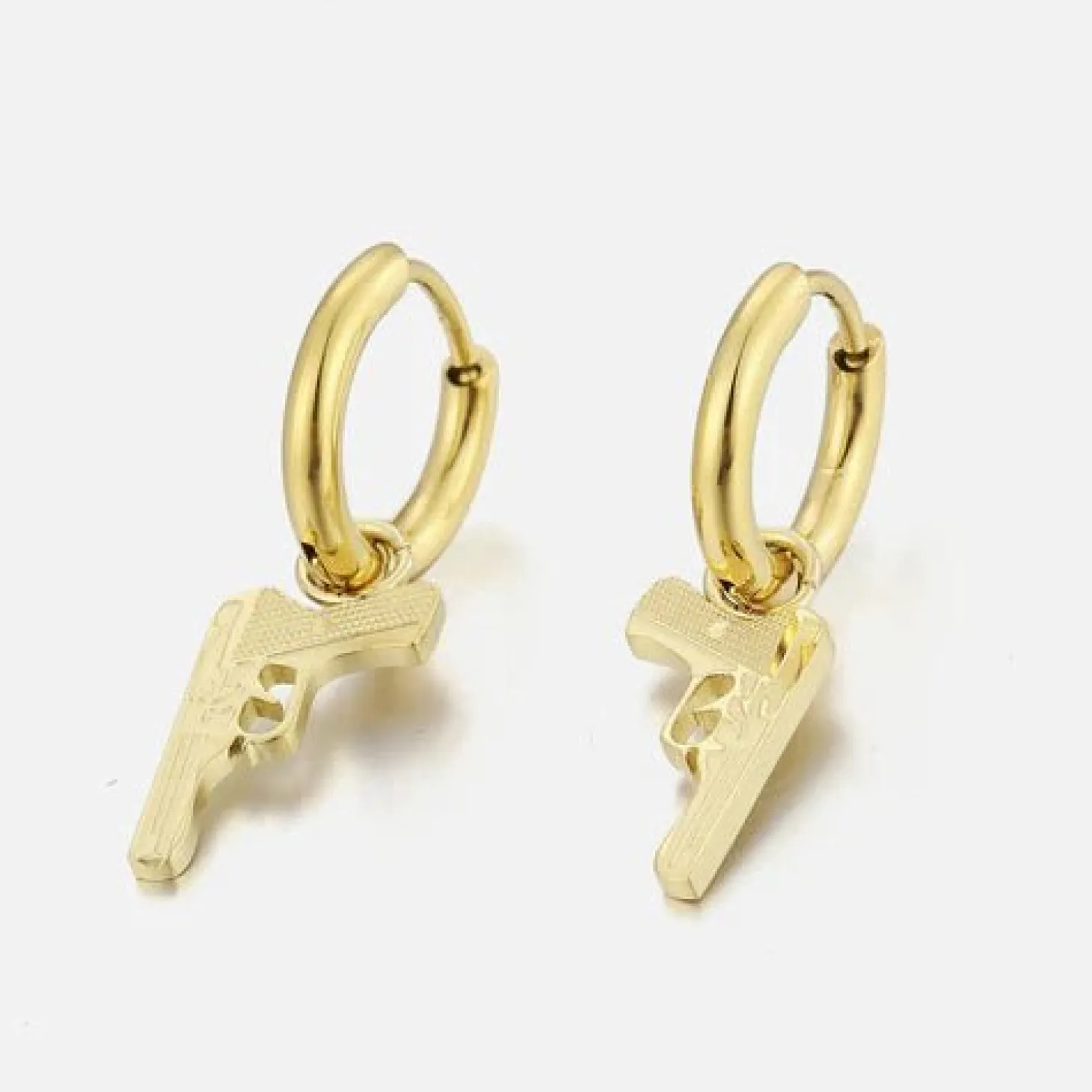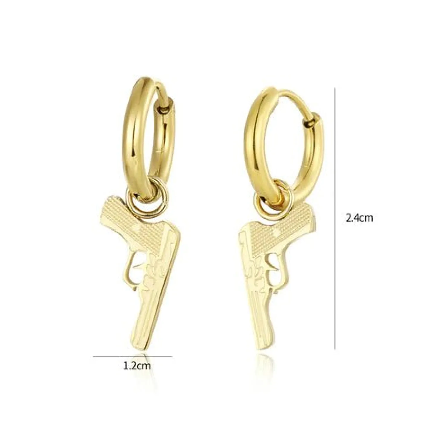 Gouden oorbellen met pistool bedeltje. Deze oorbellen zijn 2.4cm breed. Gemaakt van Hoogwaardig Stainless Steel.