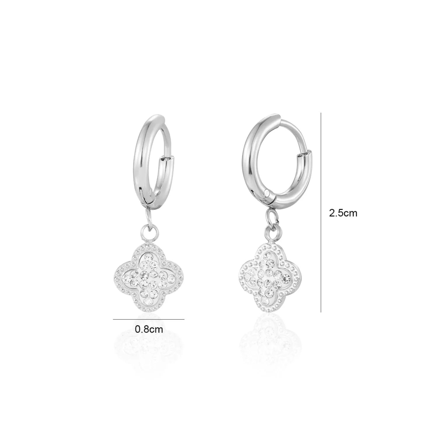 Zilveren oorbellen met steentjes klavertjevier. Deze oorbellen zijn 2.5cm lang. Gemaakt van Hoogwaardig Stainless Steel.