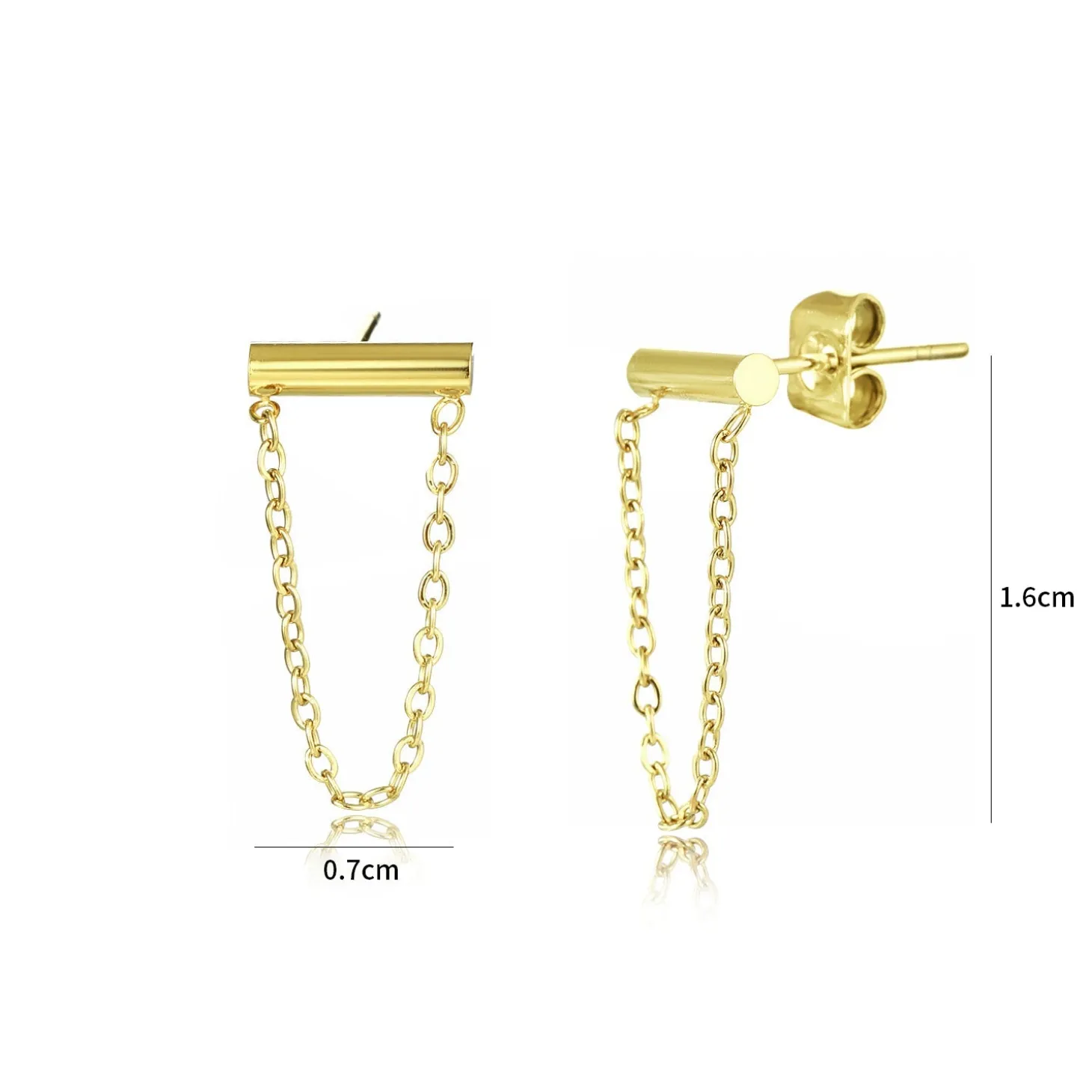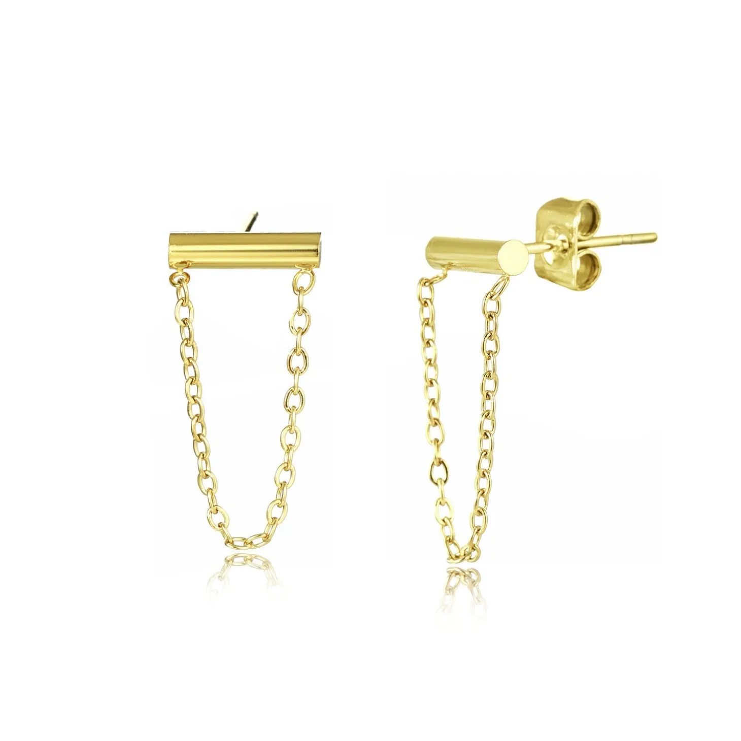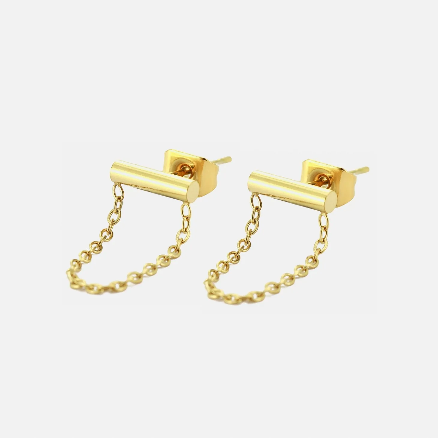 Gouden studs met ketting. Deze oorbellen zijn 1.7cm lang. Gemaakt van Hoogwaardig Stainless Steel.