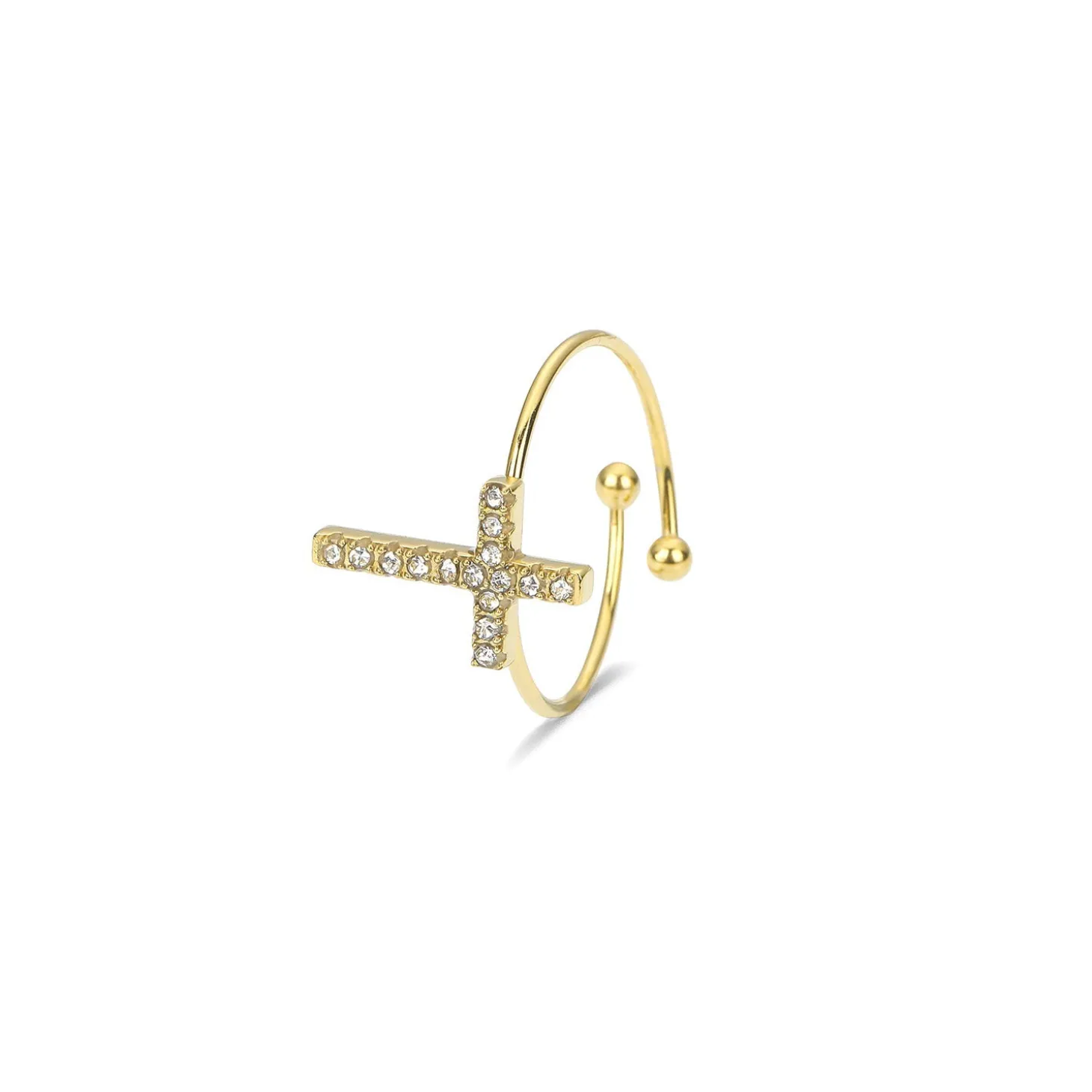 Gouden ring met kruisje en steentjes. Verstelbaar naar jouw gewenste maat. Gemaakt van hoogwaardig stainless steel.