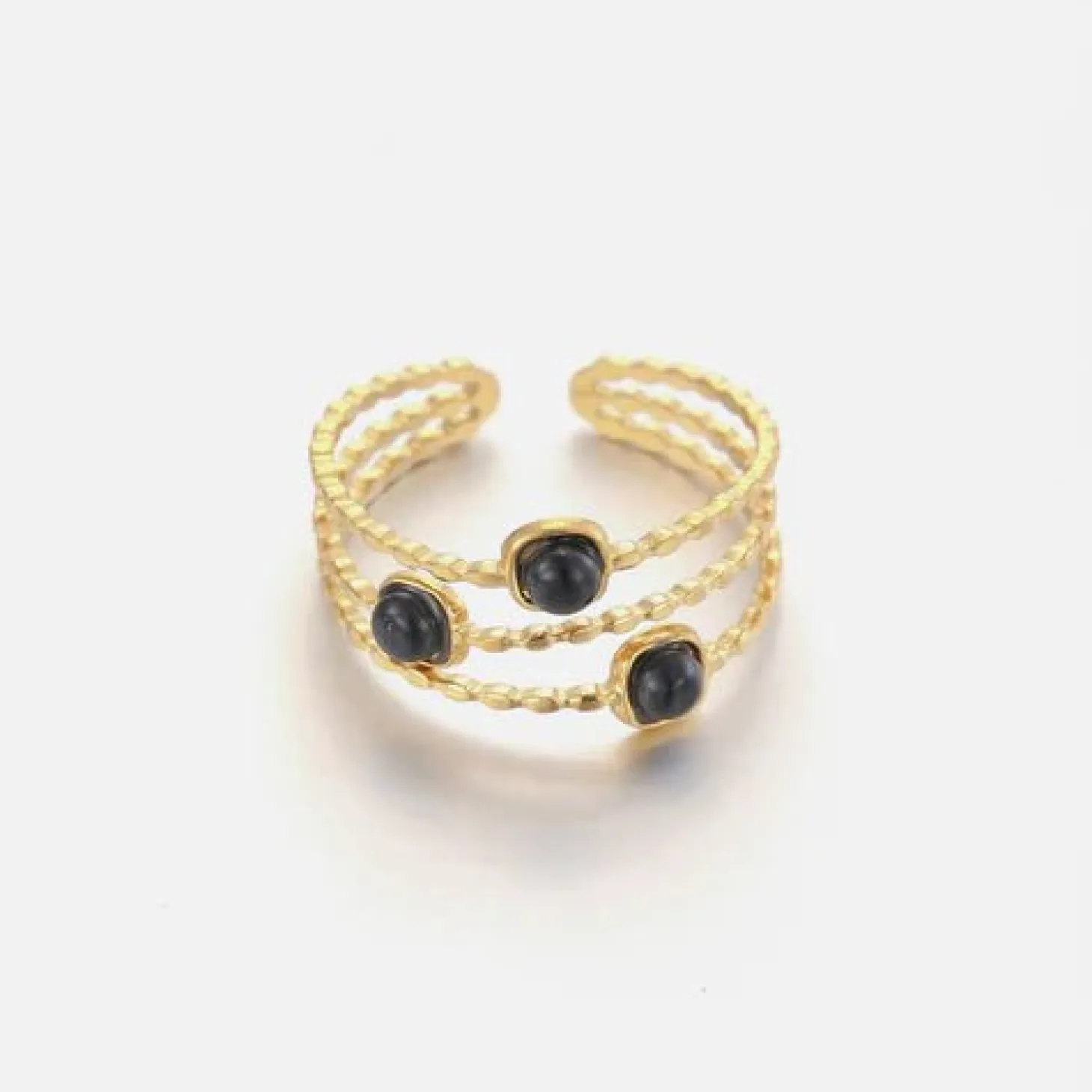 Gouden ring met zwarte stenen. Ring is verstelbaar naar jouw gewenste maat. Gemaakt van hoogwaardig stainless steel.