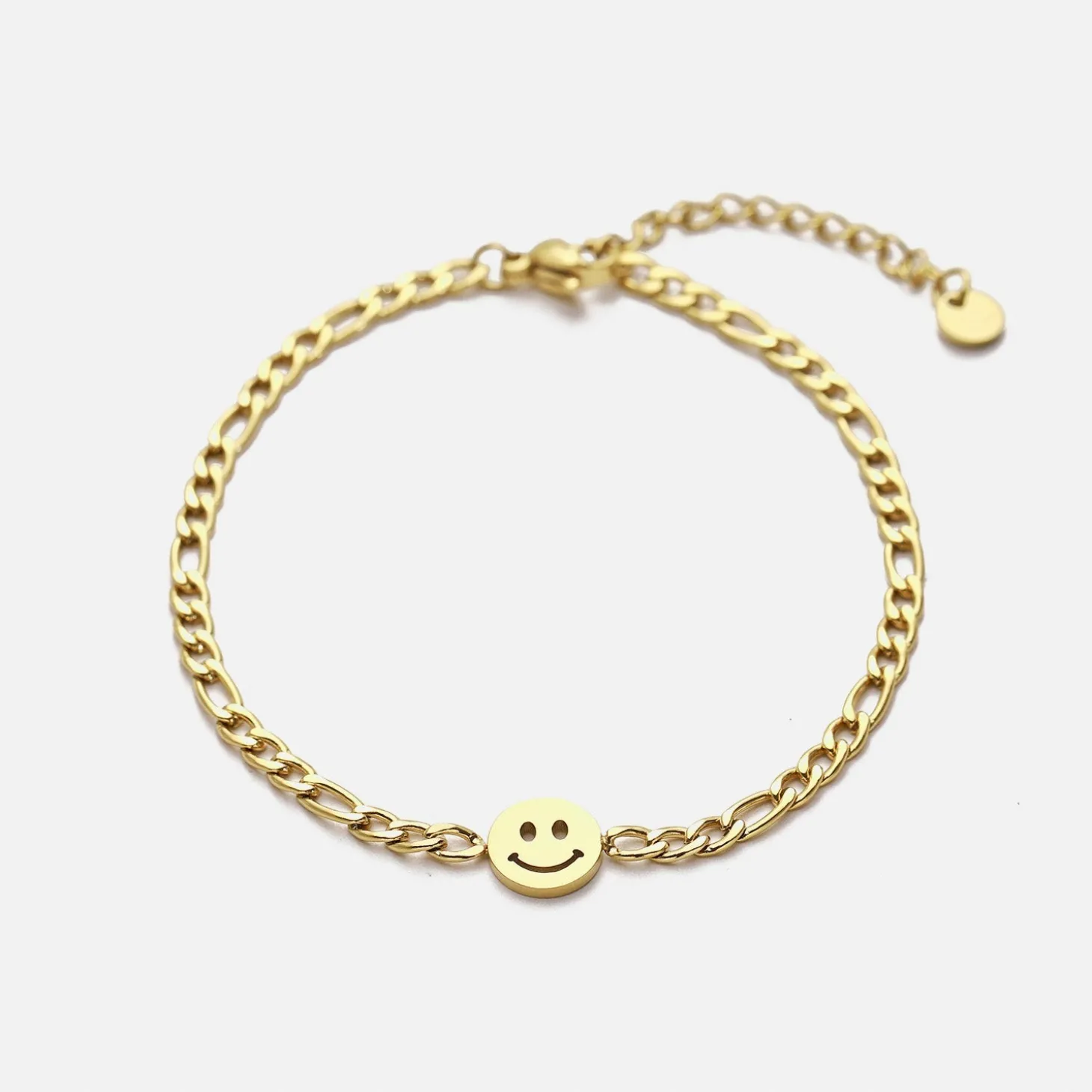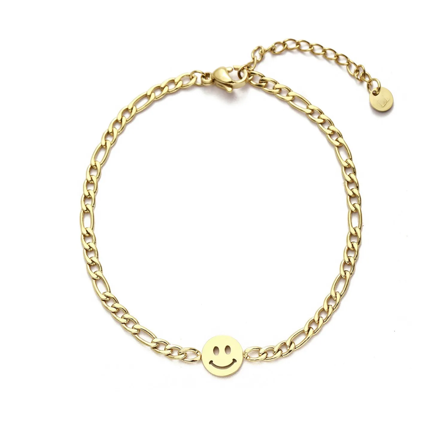 Gouden schakel armband met smiley. 16 cm lang en kan nog eens met 4 cm verlengd worden. Gemaakt van hoogwaardig stainless steel. Dankzij het verlengstukje is de armband verstelbaar en geschikt voor verschillende polsmaten.