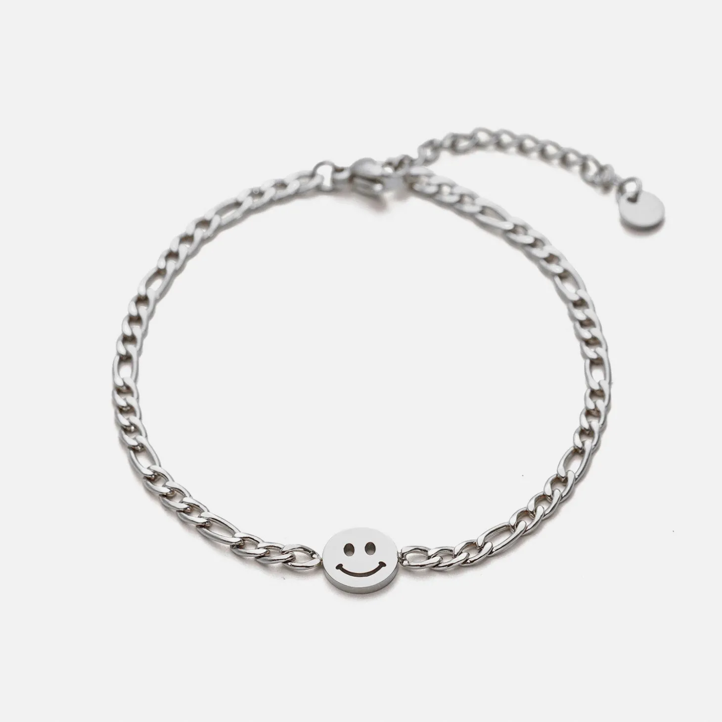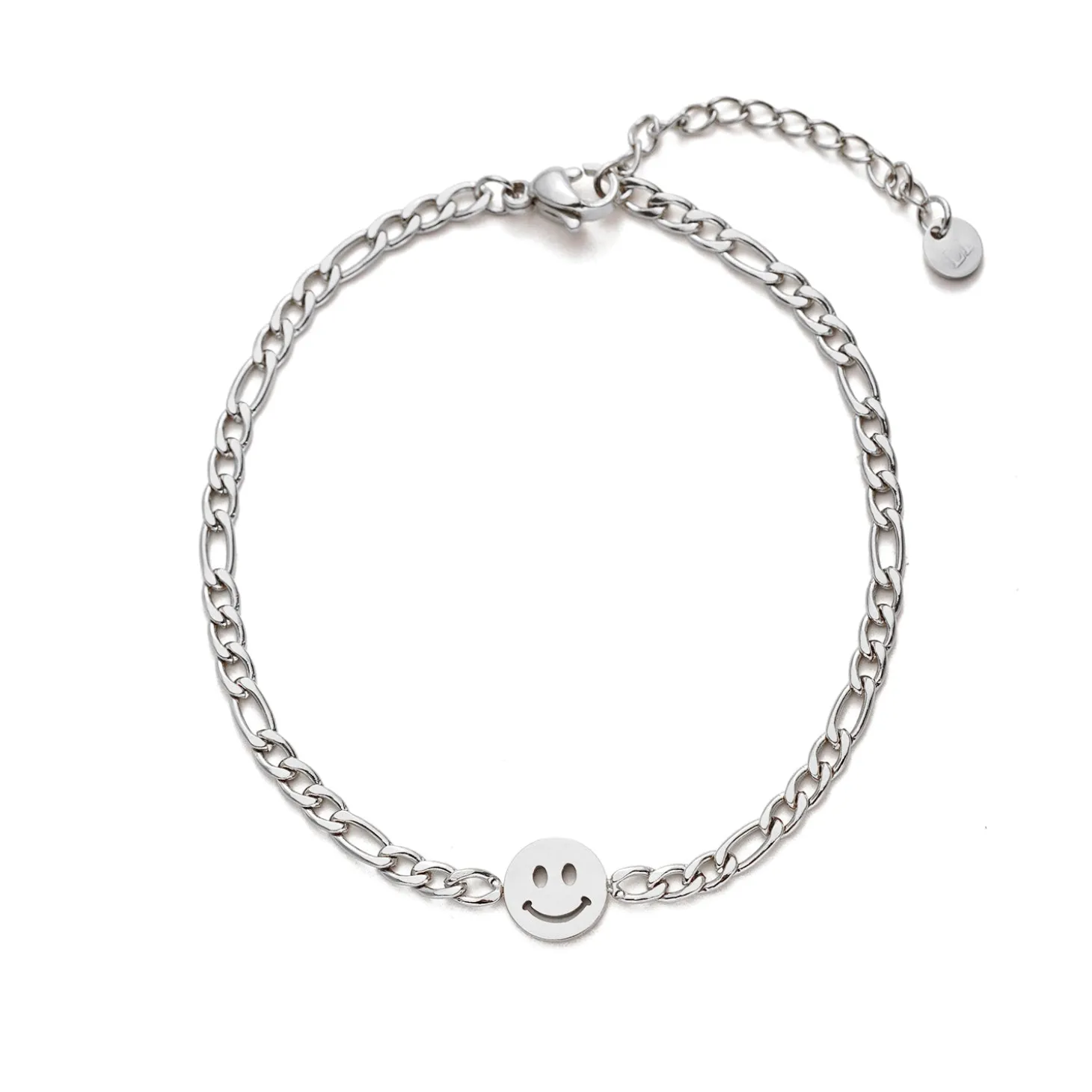 Zilveren schakel armband met smiley. 16 cm lang en kan nog eens met 4 cm verlengd worden. Gemaakt van hoogwaardig stainless steel. Dankzij het verlengstukje is de armband verstelbaar en geschikt voor verschillende polsmaten.