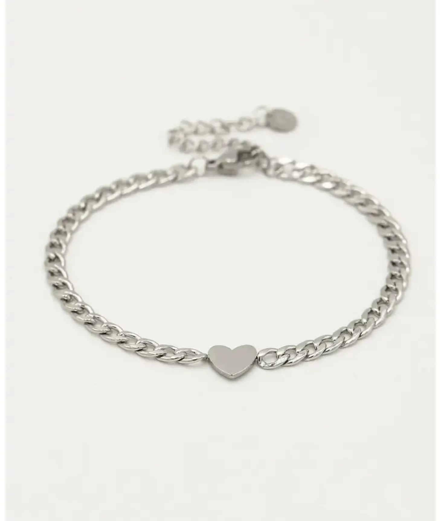 Zilveren schakel armband met hartje. 16 cm lang en kan nog eens met 4 cm verlengd worden. Gemaakt van hoogwaardig stainless steel. Dankzij het verlengstukje is de armband verstelbaar en geschikt voor verschillende polsmaten.