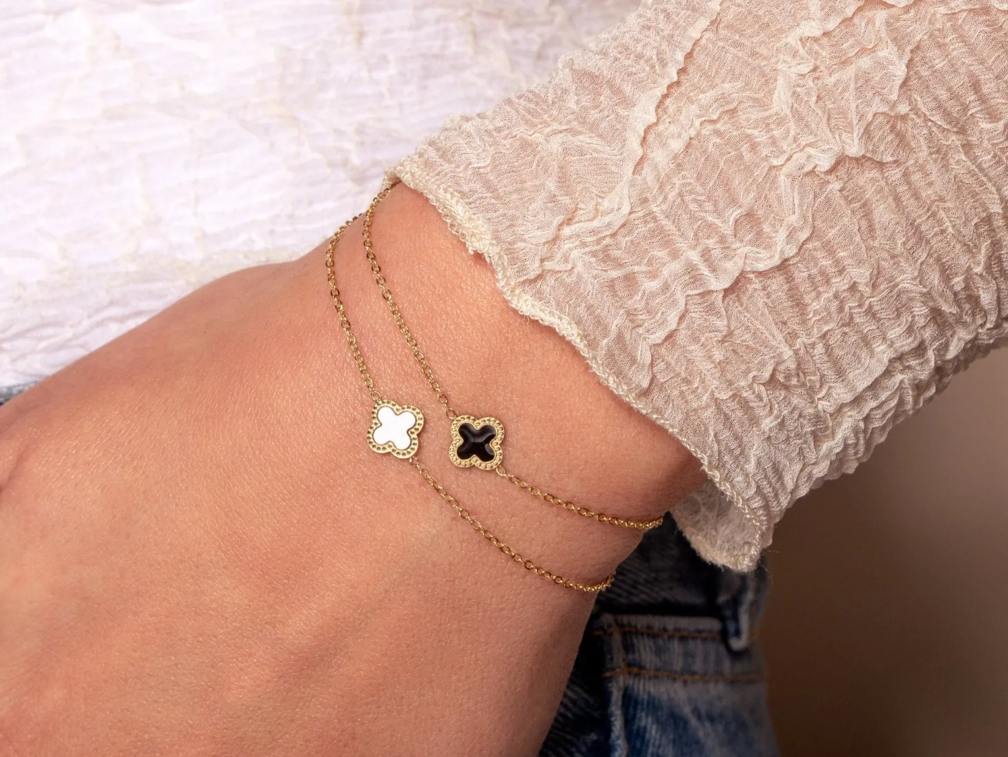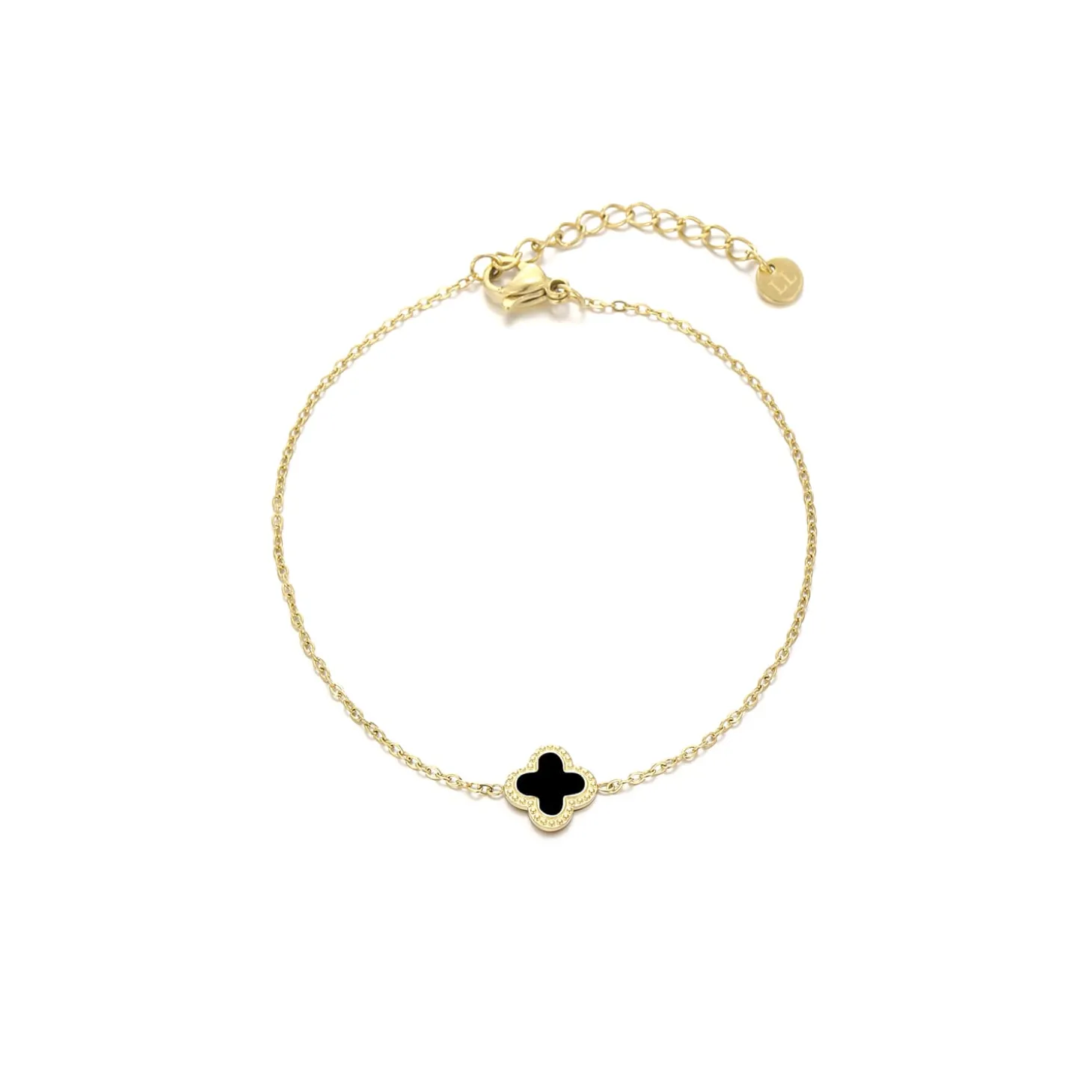 Gouden armband met zwarte klavertjevier. 16 cm lang en kan nog eens met 4 cm verlengd worden. Gemaakt van hoogwaardig stainless steel. Dankzij het verlengstukje is de armband verstelbaar en geschikt voor verschillende polsmaten.