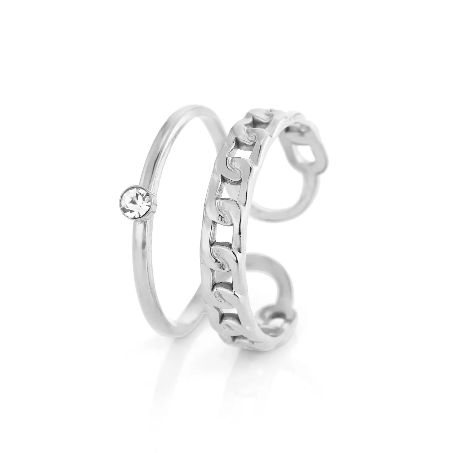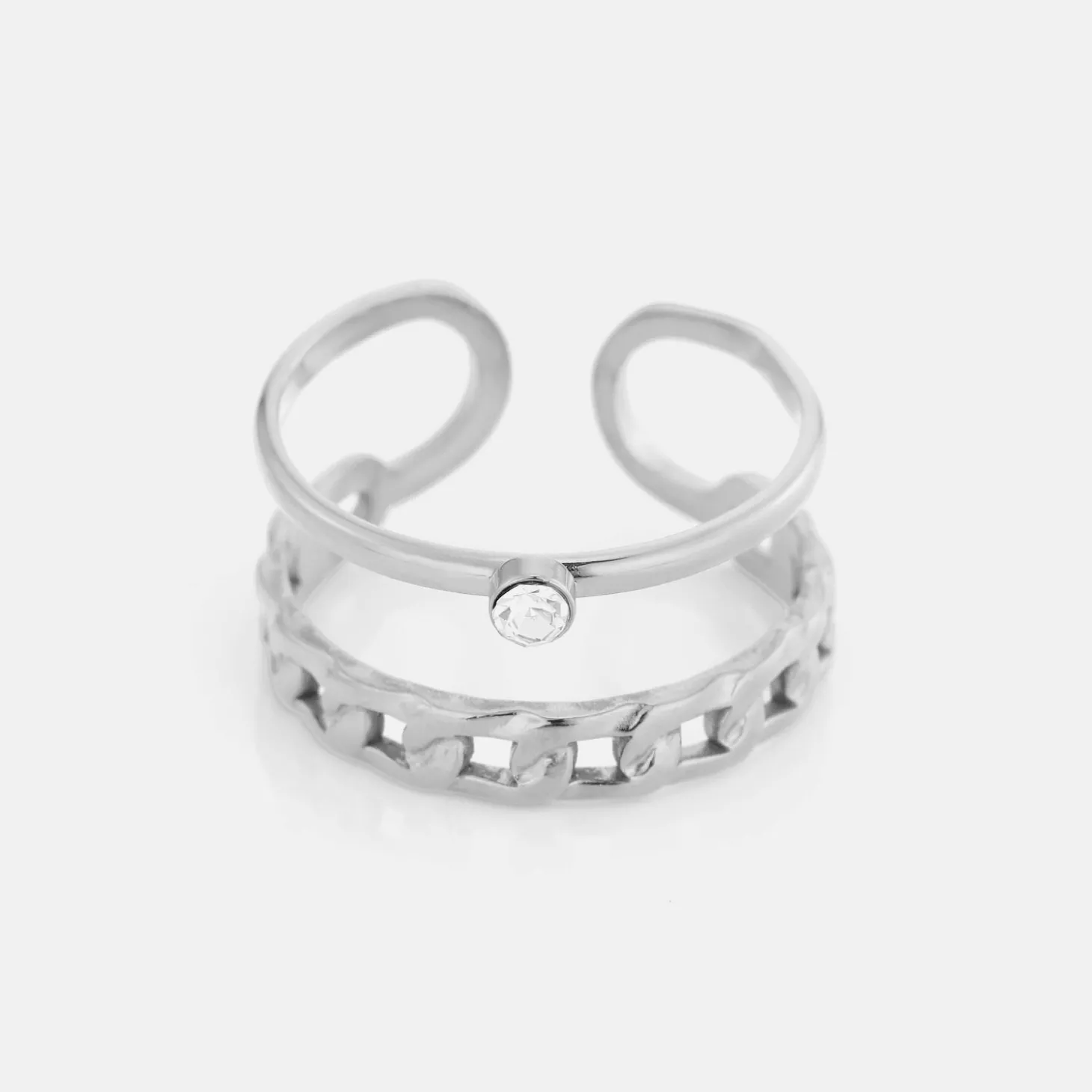 Zilveren tweelaags ring met diamantje. Gemaakt van Hoogwaardig Stainless Steel. Deze ring is verstelbaar naar de gewenste ring maat.